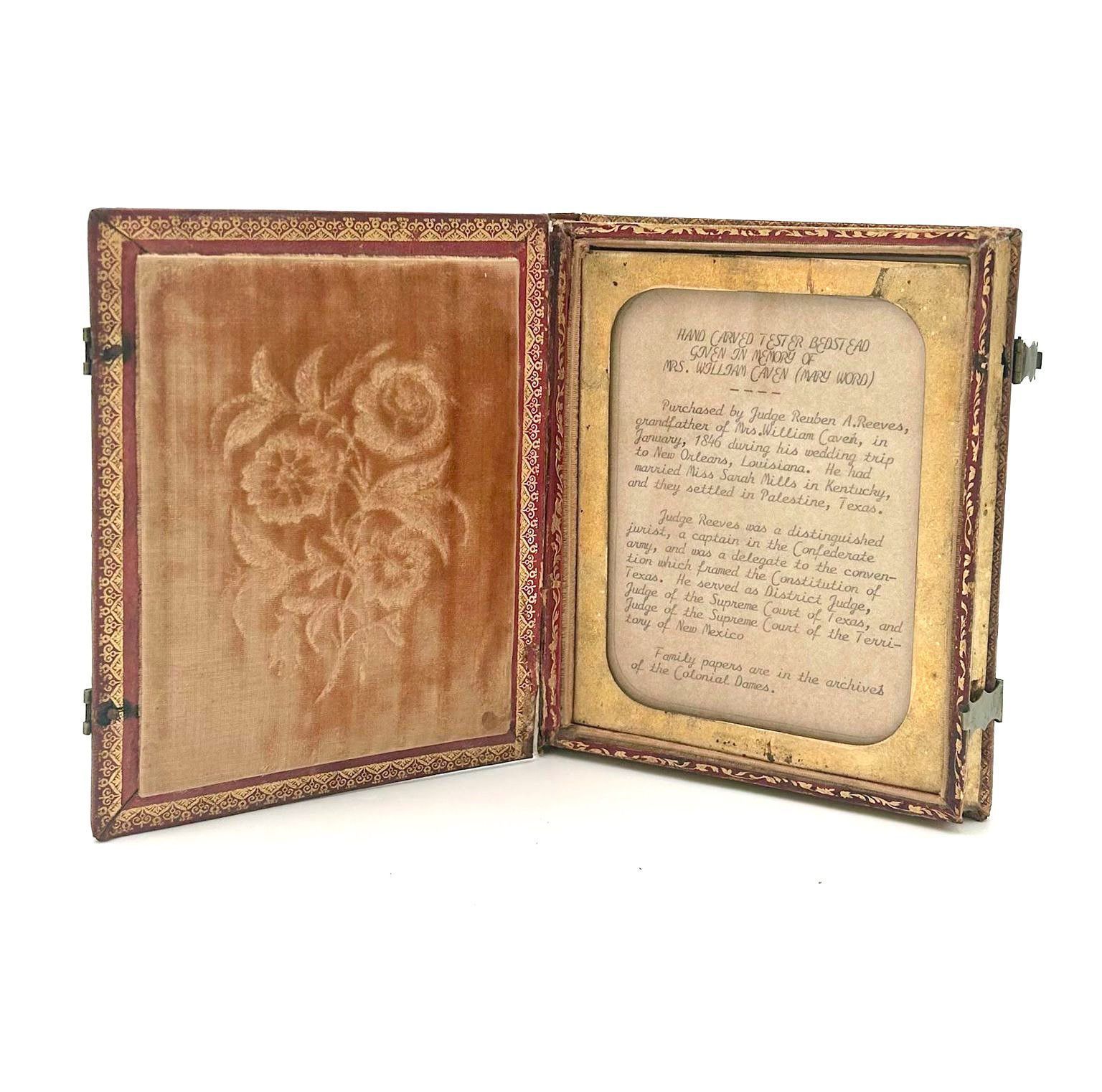 Leather bound book, the outer front cover is decorated with gold scroll and flowers. The book features two hasps and the interior front cover is buff colored velvet with a rose design. The back interior back cover contains information regarding the half-tester bed that is featured in the 1855 Bedroom.