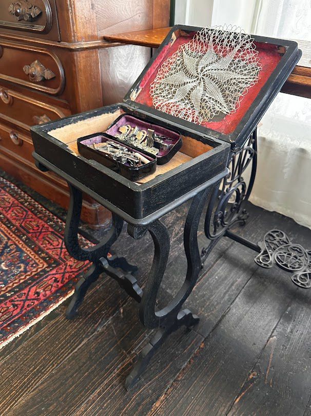 This black painted sewing box sits in the Cochran Girls' Room atop lyre shaped legs. The box's top is inlaid with abalone shell and has painted floral decorations.Acquisition