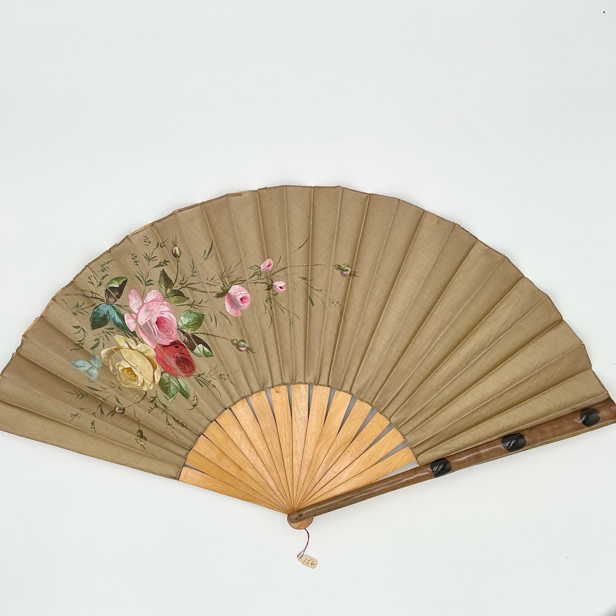 Painted brown satin leaf with bamboo sticks and guard sticks. This substantial fan