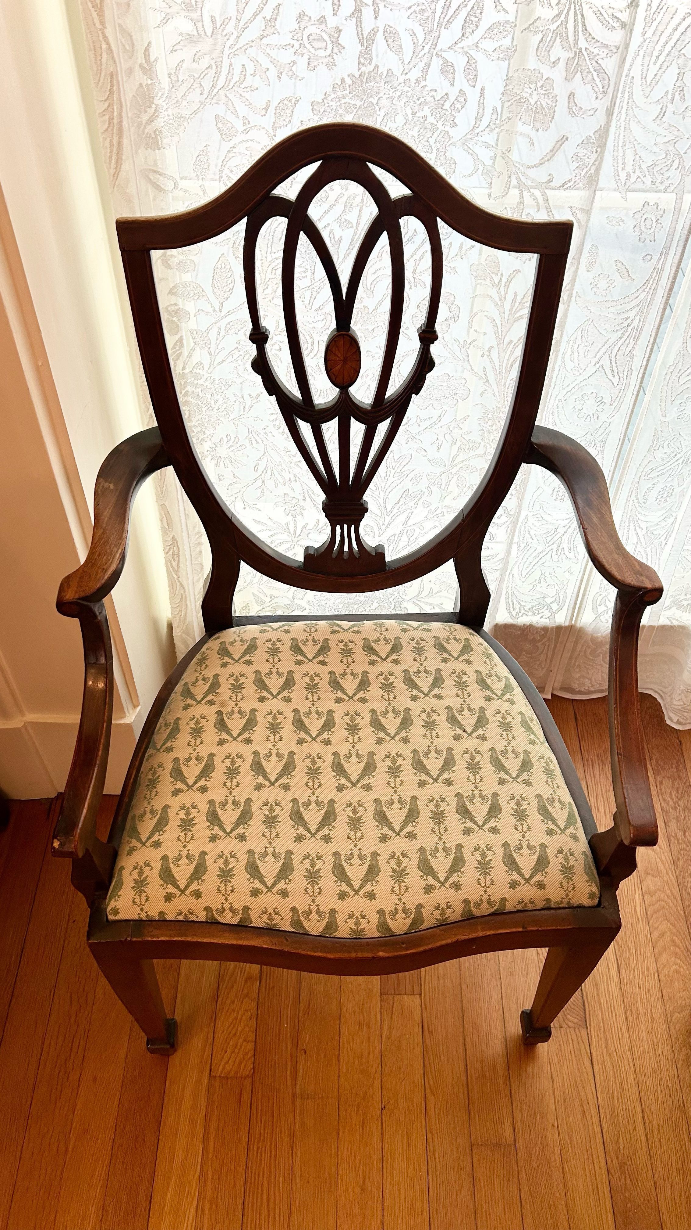 English, ca. 1880. Reproduction Georgian Hepplewhite- style Chairs feature mahogany inlaid with lighter wood, with shield-backs with tapered legs. Furniture in this style was popular in England and America from 1790-1815 and is characterized by the use of classical motifs derived from discoveries at Pompeii and other Roman archaeological sites.