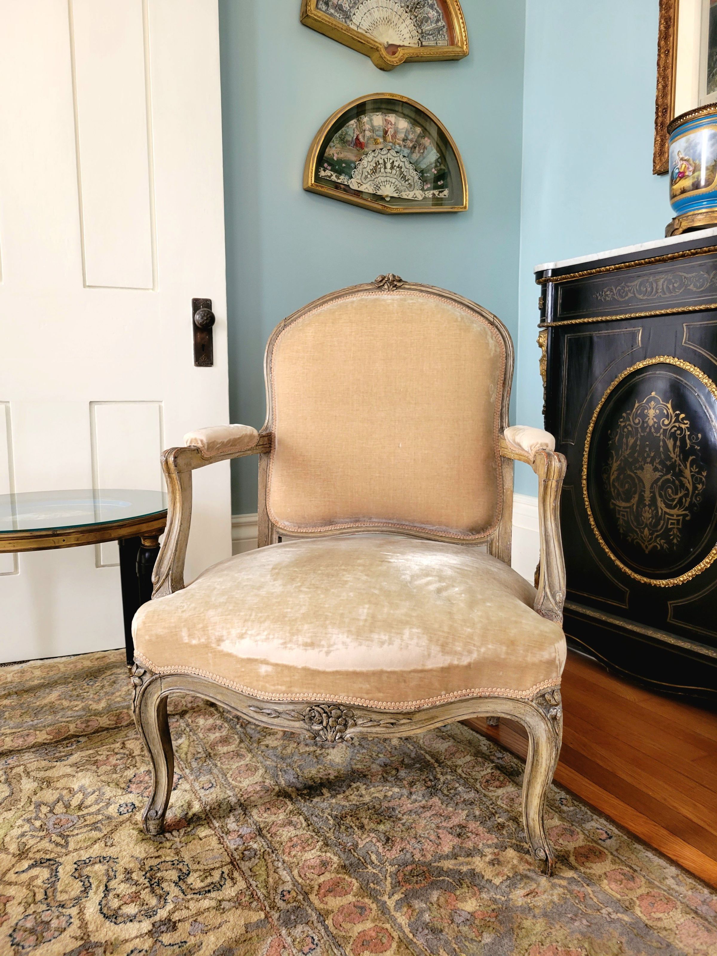 French, ca, 1820-1850. Louis XVI style armchair with carved wooden frame and old, but not original, beige velvet upholstery trimmed with braid.