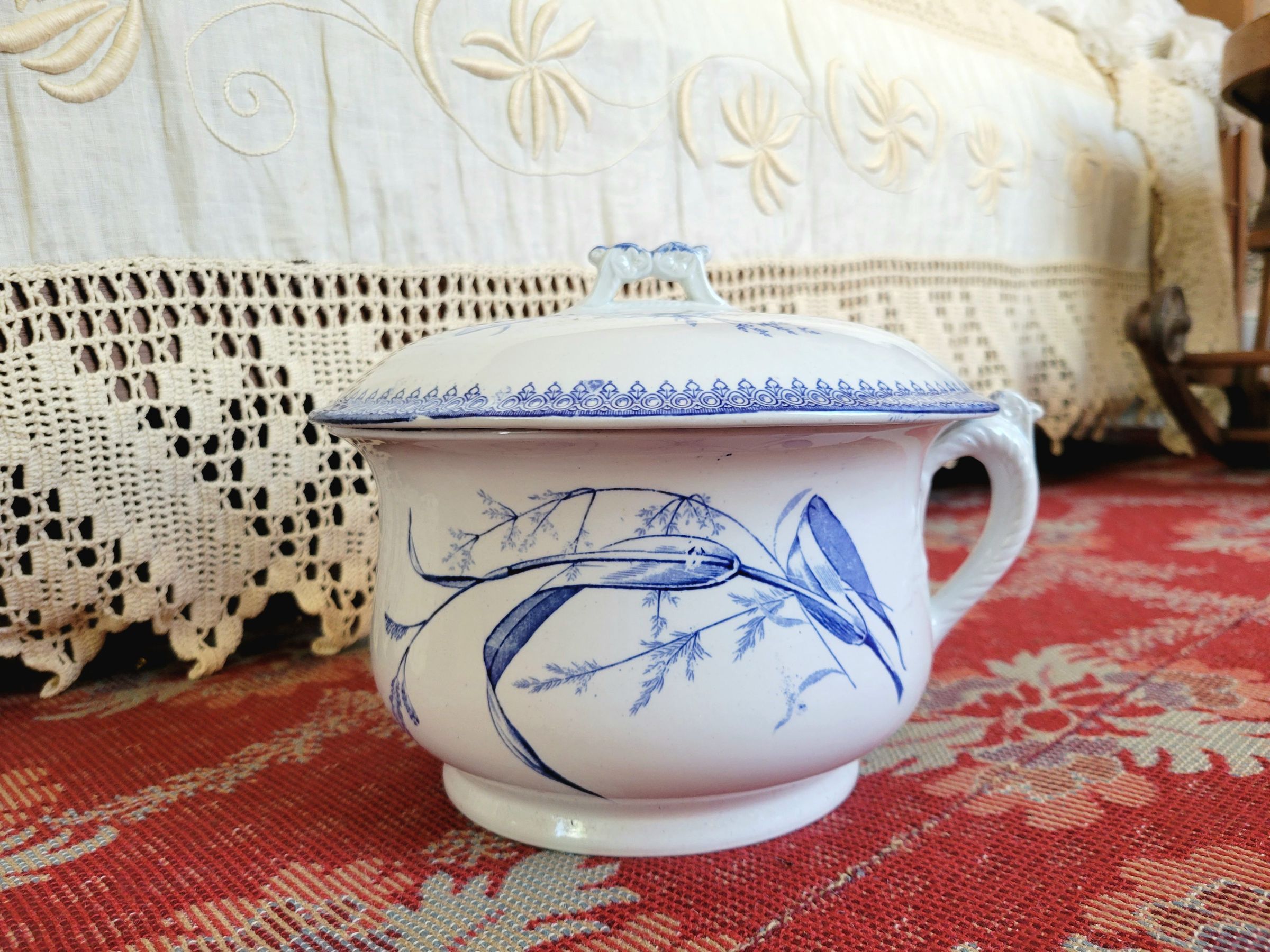 The chamber pot consists of a porcelain pot with a handle on the side and a porcelain lid with a small handle on top. The pot and lid are made of blue and white porcelain decorated with prints of wheat and butterflies. The rim of the pot and rim of the lid, as well as the lid handle, are embellished with a repeating "summertime" pattern in blue.