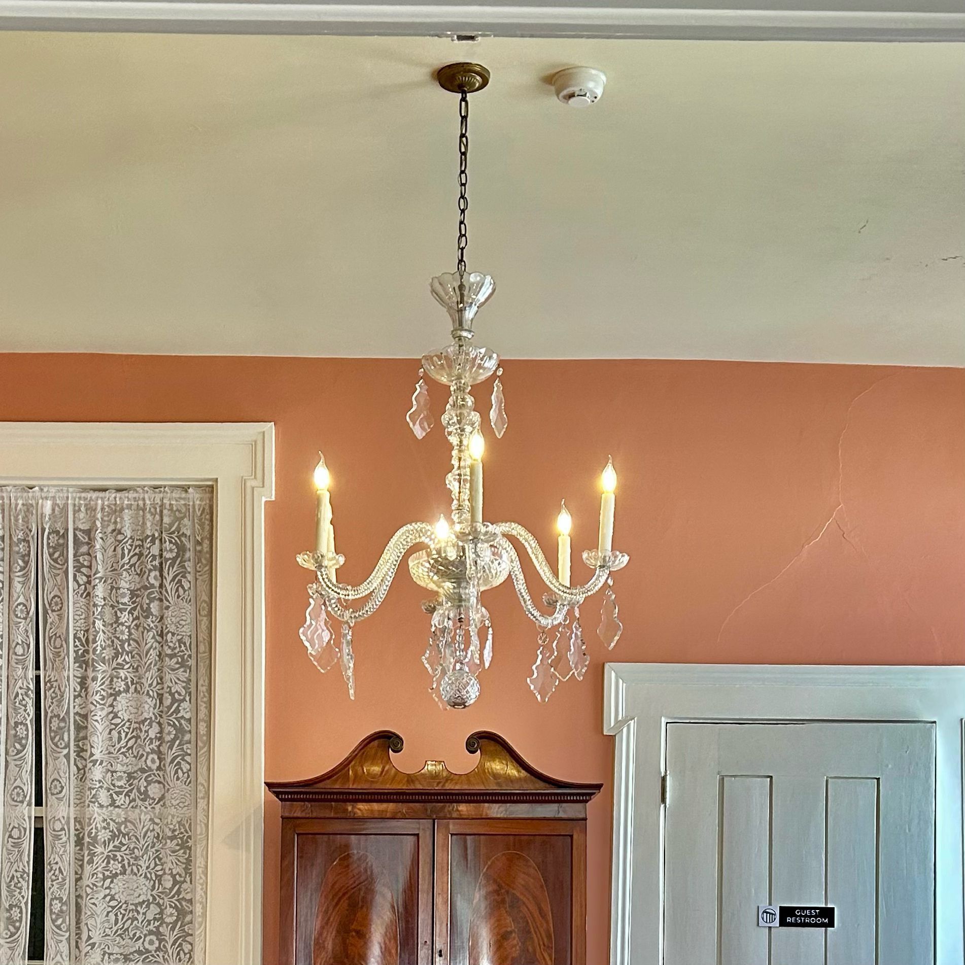English, 1900-1950. George III style six- light chandelier with crystal arms and prismatic ropes and drops. Originally a gas fixture, the chandelier has been updated with electric wiring that now runs through the arms of the piece. Originally hung in the Austin Women's club.