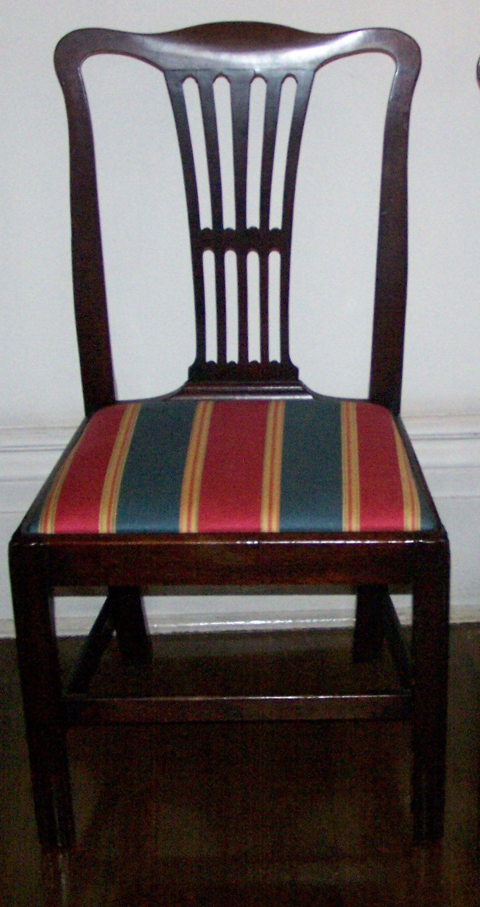 Irish, ca 1770. George III Chippendale style mahogany dining chair (one of six). Curved bow shape at top of frame from which five narrow slats joined in the middle form a splat. Front legs straight, sightly tapered. Back legs curve very slightly. Gift of Mrs. Edwin M. Jones, Mr. & Mrs. Ike S. Kampmann, Sr., Mrs. William Moyse Ratliff, Mrs. Lewis DuPont