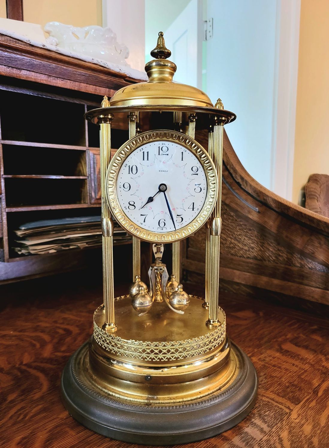 On top of Judge Thomas Cochran's desk in the Upstairs Hall of the Neill-Cochran House Museum sits a brass clock under a glass dome. This clock was made by Kienzle, Germany's oldest watchmaking company, founded by Johannes Schlenker in 1822 in the city of Schwenningen. It is what is known as a perpetual motion clock, or a "400-day anniversary clock," because it only needed to be wound every 400 days.