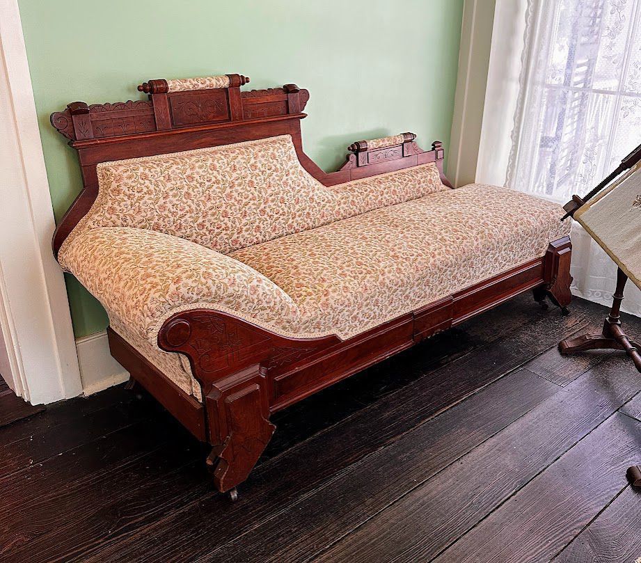 American, early 20th century. Eastlake style fainting couch. The cushion and front legs pull forward to reveal a bed. This piece was in a house several blocks away on Nuecess Street ca. 1920.