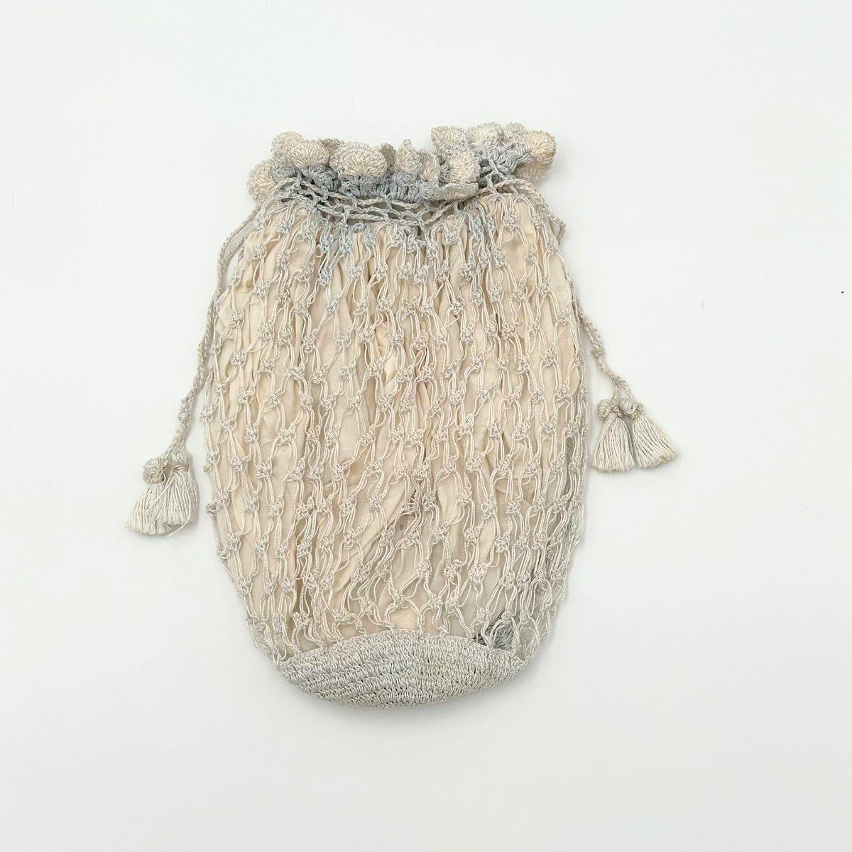 This drawstring purse is made of white and blue string lace and crocheted at the top and bottom. The bag is lined with heavily gathered white silk and appears handmade. The lining is only connected to the overlay of the bag by the gathers at the top and there is a small padded square sewn into the inside bottom of the overlay, presumably to help the bag retain its teardrop, cylindrical shape while being worn.Acquisition