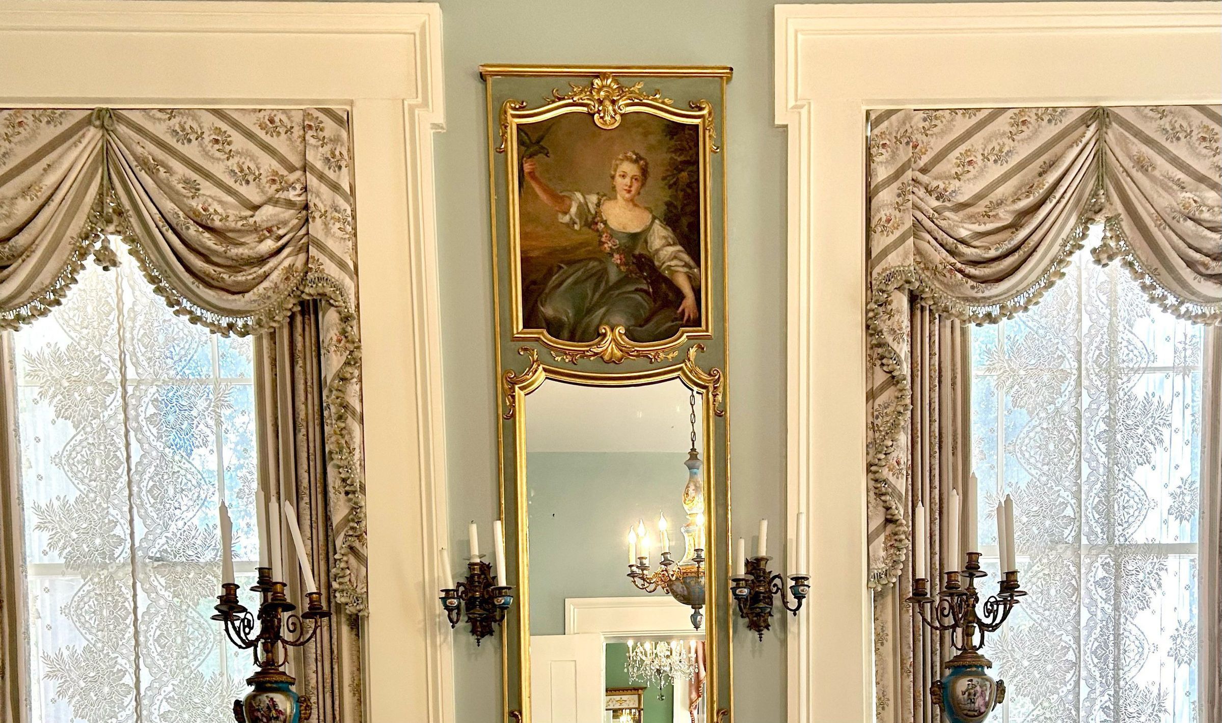 French, nineteenth century. Rococo style, painted, light blue wood with gold trim. Top half holds a variation of a portrait of 14 year old Mathilde de Canisy (Marquise d'Antin) originally painted by Jean-Marc Nattier in 1738. The original is in the collection of the Musée Jacquemart-André in Paris, France.