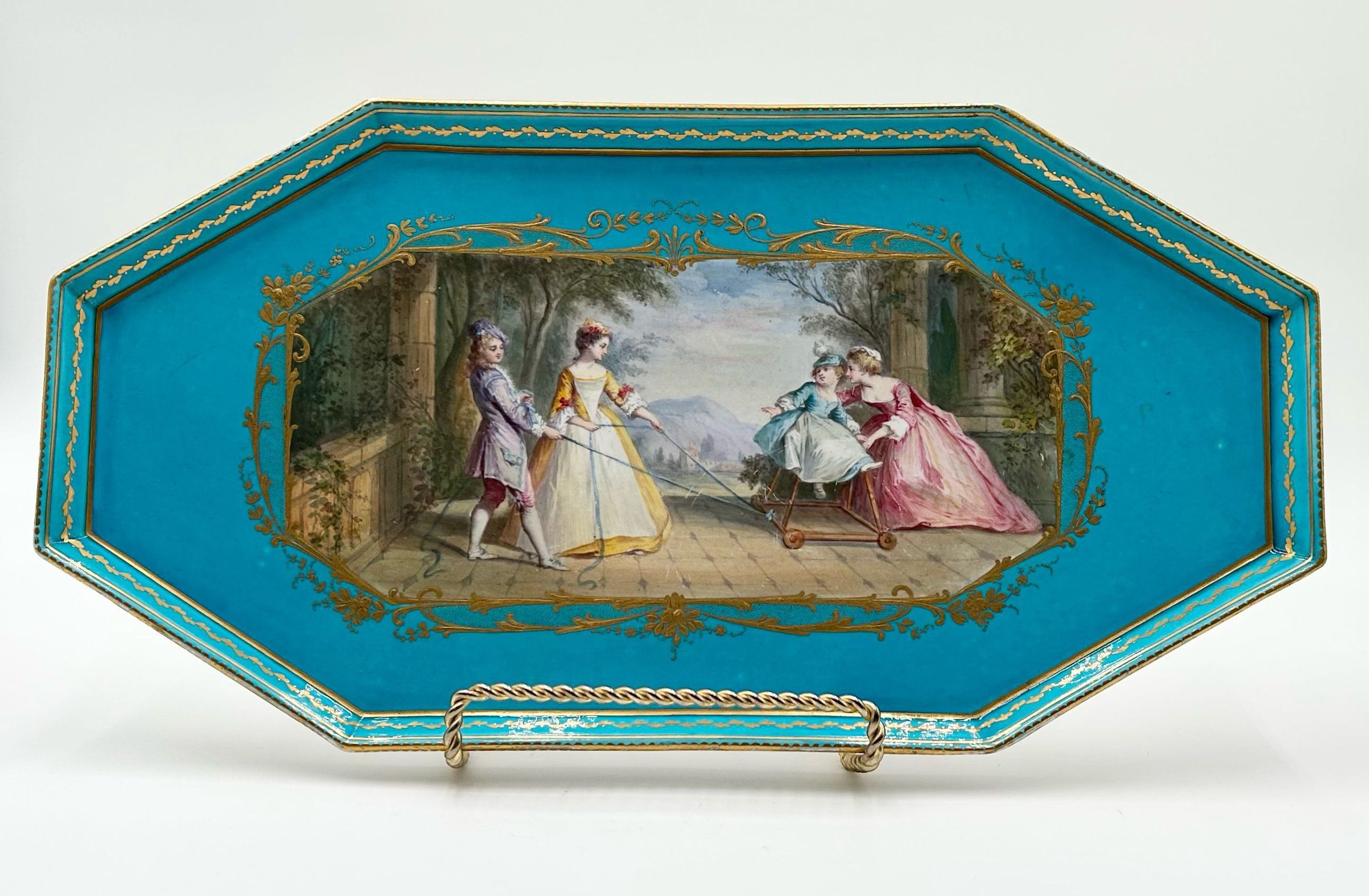 This tray bears the original Sèvres production marks and quality. The playful scene depicted in the center of the tray is a beautiful example of the "Fête galante" genre. In an open-air loggia children play games.