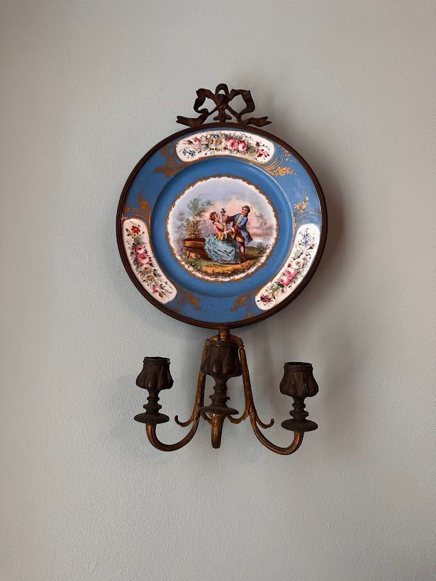 French, ca. 1850-1880. Each holds a Sevres style bowl with three delicate, curved, brass arms extending into three candleholders. Main medallions depict a man serenading a women inspired by Jean-Antoine Watteau's La gamme d'amour, and a couple with a basket of flowers after Francois Boucher's Pastorale and the Four Seasons: Autumn.