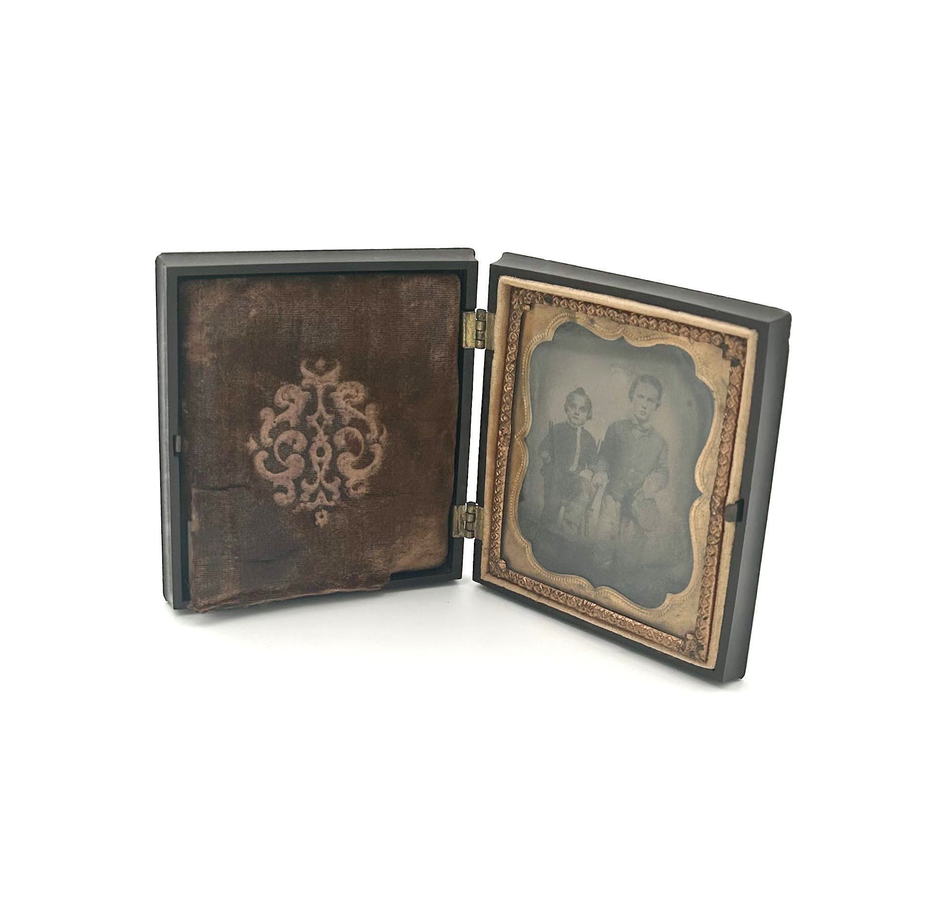 Daguerreotype plates are known to be very fragile. Therefore, the delicate image is covered by a cover glass and sealed inside the frame. On the opposite side of the portrait a velvet casing ensures supplemental protection. The book-like case is a so-called “Union Case” which prevented daguerreotypes from shattering and are an example of thermoplastic technology. This process created plastic-like products, like the Neill-Cochran case, made from a mixture of wood and shellac that was pressed into a mold.