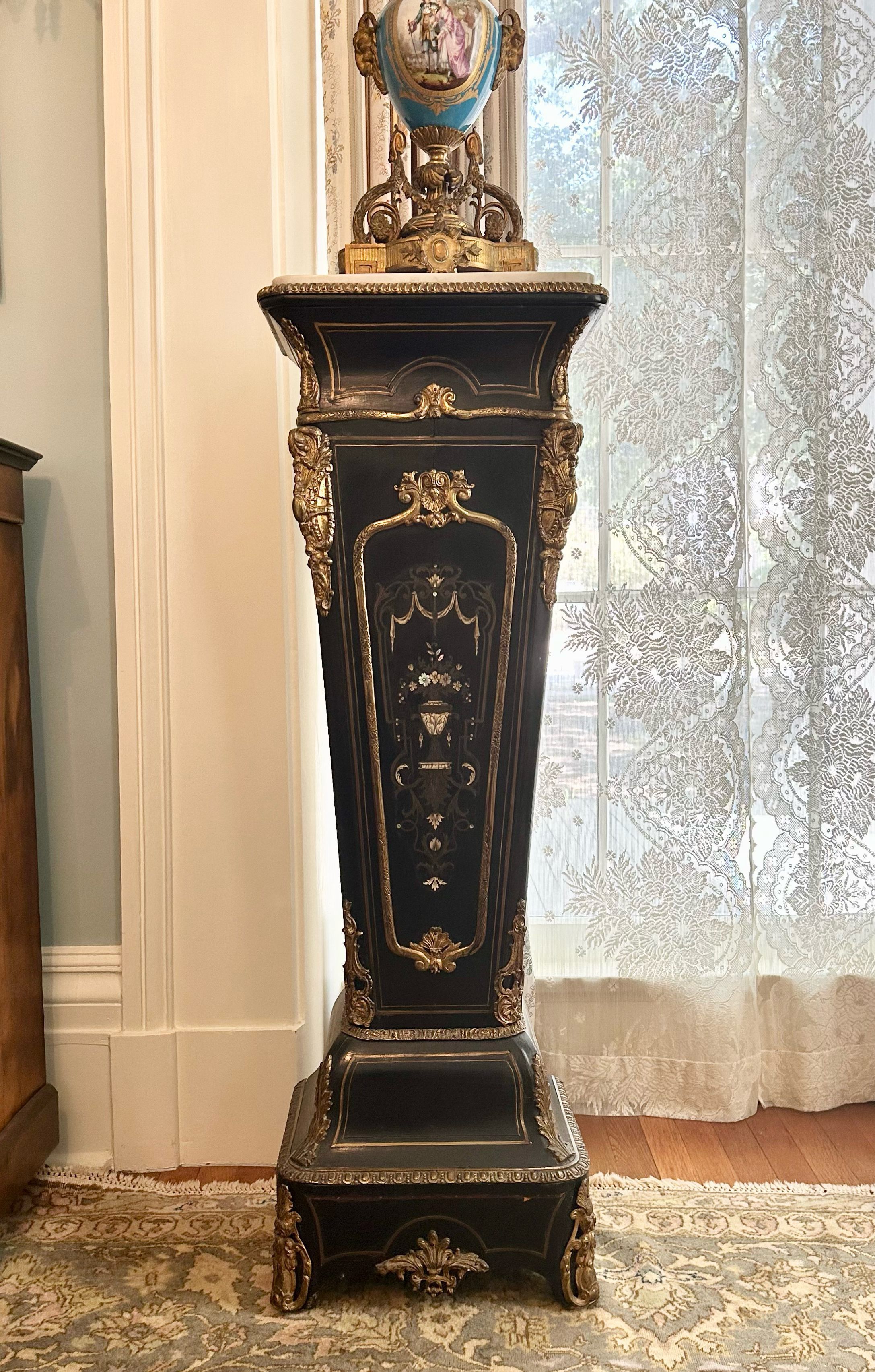 French, ca. 1880. Lacquered, ebonized wood with marble top, and inlaid brass and ivory swags above a cartouche of flowers. Corners ornamented with ormolu mounts and edges with thin strips of embossed, gilded metal.