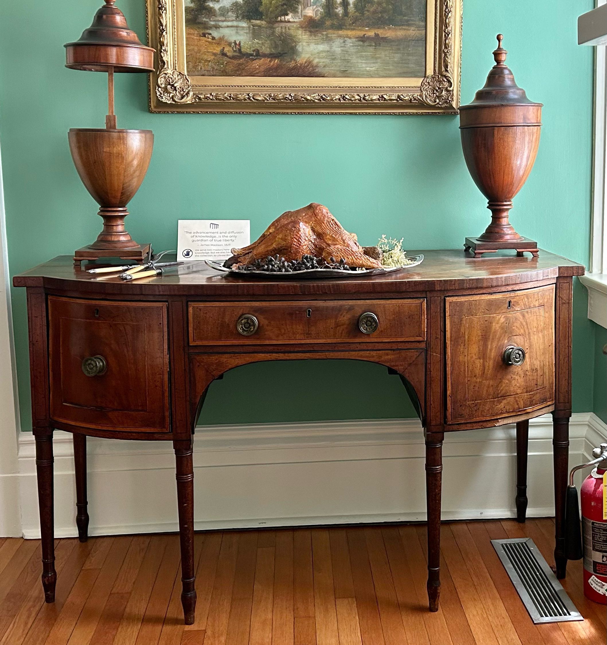 The urn-shaped knife boxes in the NCHM Dining Room are a guest favorite. People love to guess what these strange wooden "urns" are used for and are almost always surprised at the answer. Fewer people pay attention to the large wooden sideboard that these unusual knife boxes sit on.