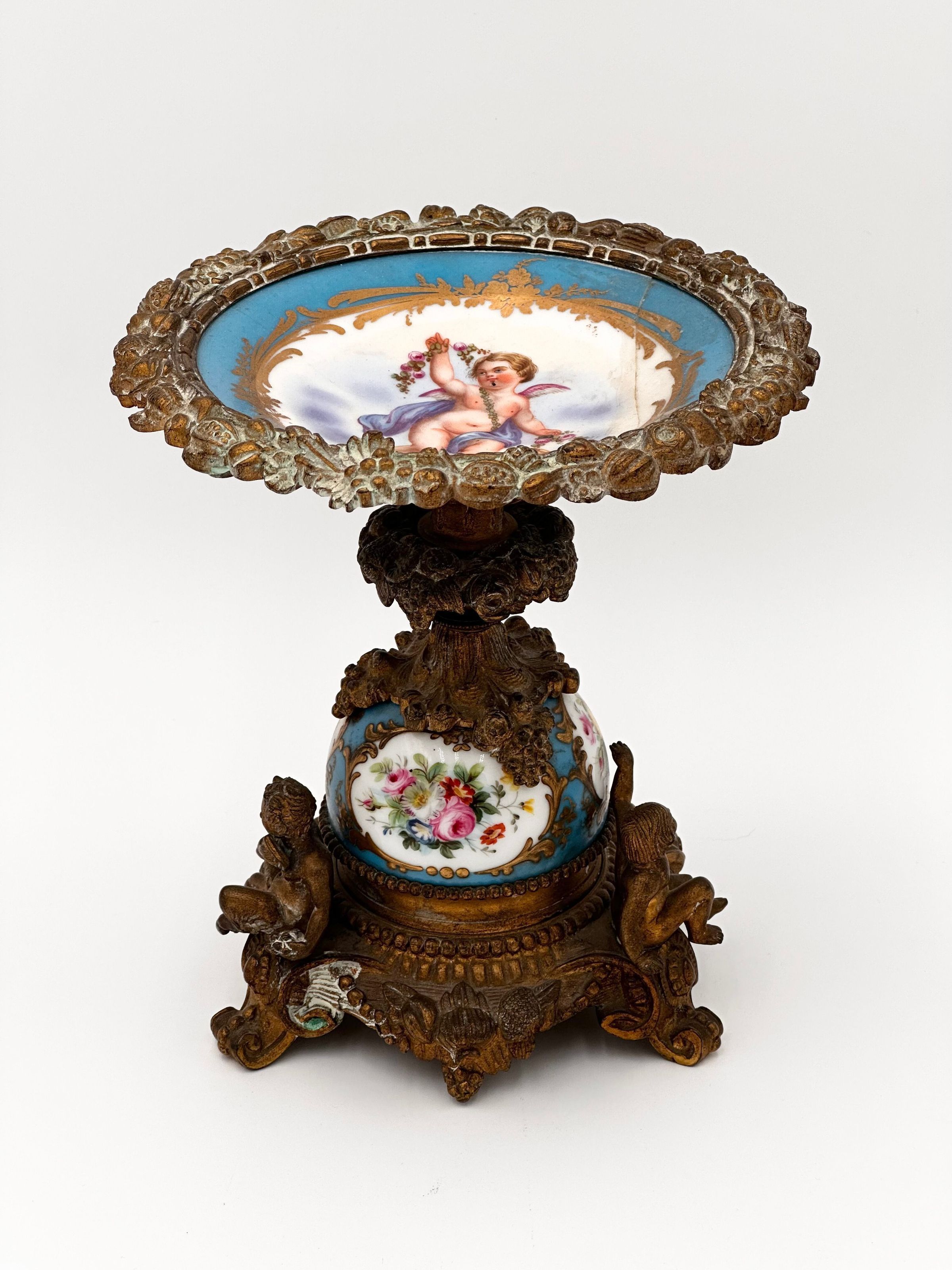 French, ca. 1820-1860. Sevres style bleu celeste porcelain gilt bronze trim of grapes and flowers. Two bronze cherubs and the Greek god of nature, Pan, grace the base. Gift of Mrs. Leonidas T. Barrow.