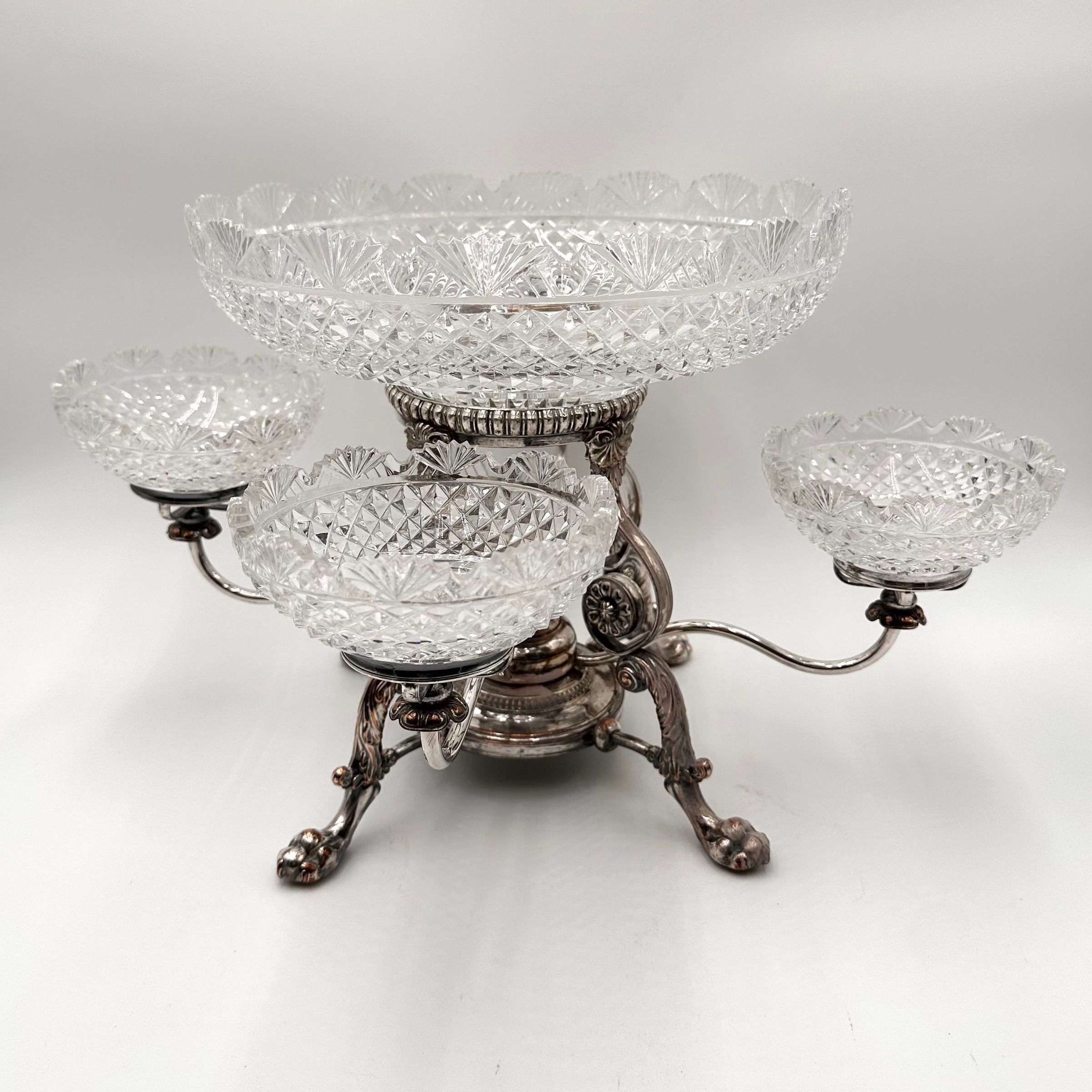 Sheffield Épergne (1860) of glass and silver with one large center bowl and four small bowls.