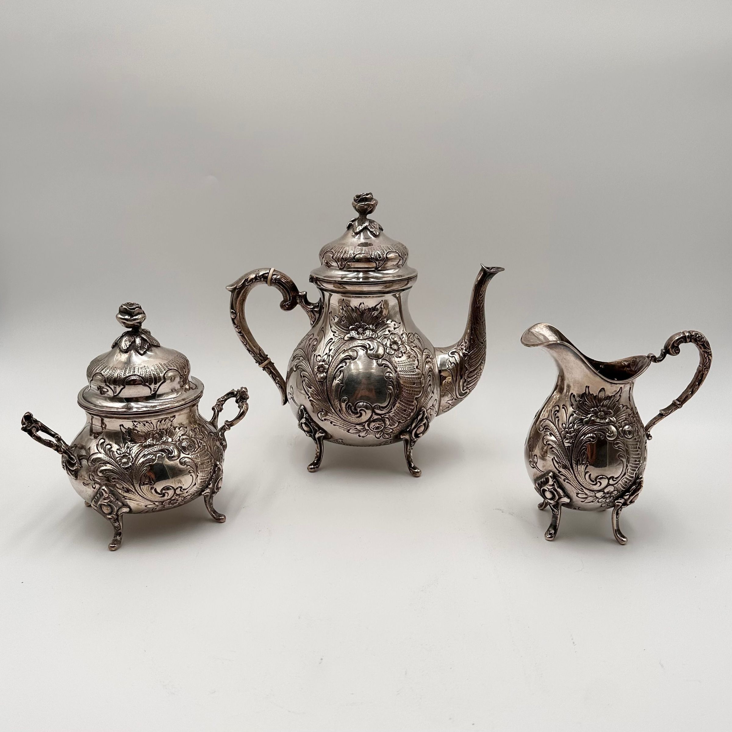 German Sterling Silver Tea Service in the Rococo style. The Hallmarks on the service (encircled letters : WH/H) cannot be identified but it is indicated in German that it is "handmade" (Handarbeit) "Sterling Silver 925" which confirms a German provenance and production.