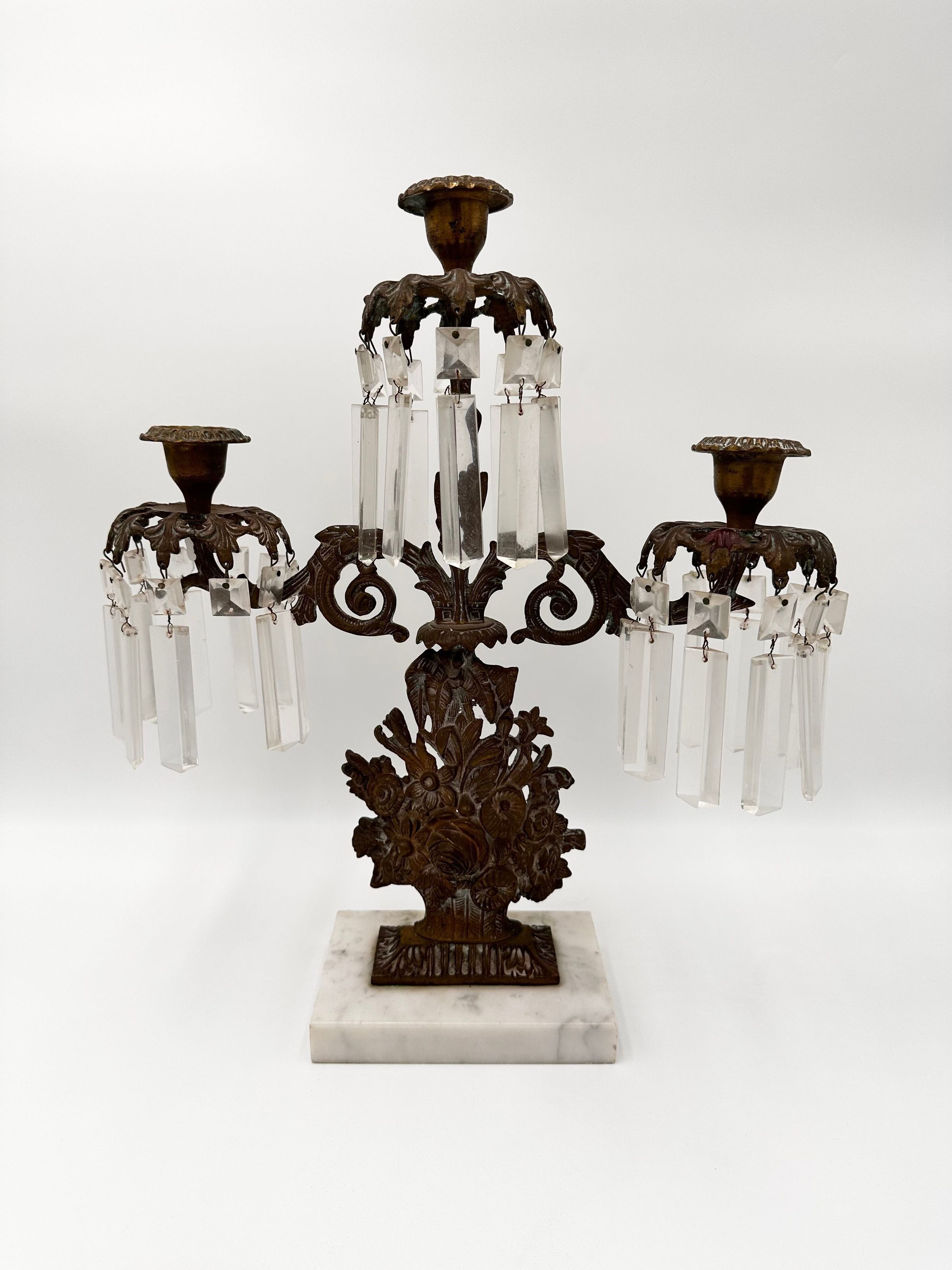 French, ca. 1880. Three-light girandole(one of a three-piece set). Bronze base depicts a bouquet of metal flowers. Nine three sided prisms hang from each arm. Base is white marble.