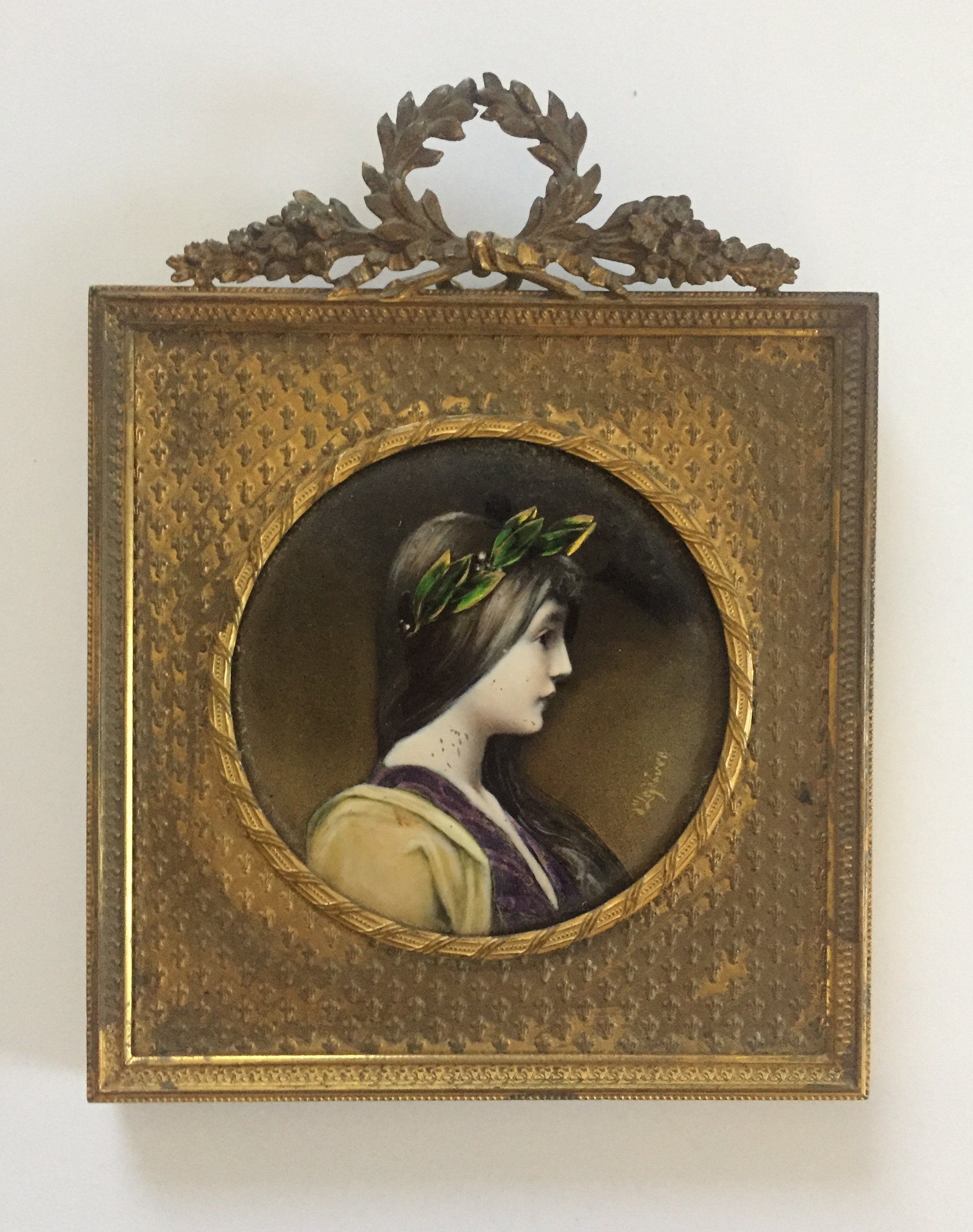 This enameled copper miniature in the Neoclassical style, and therefore inspired by antiquity, represents a woman’s profile. The square golden frame with ornaments at the top is in the Louis XVI style. Bearing a golden stand on the back for display, as well as a golden hoop to be hung on the wall, the frame bears a double functionality.