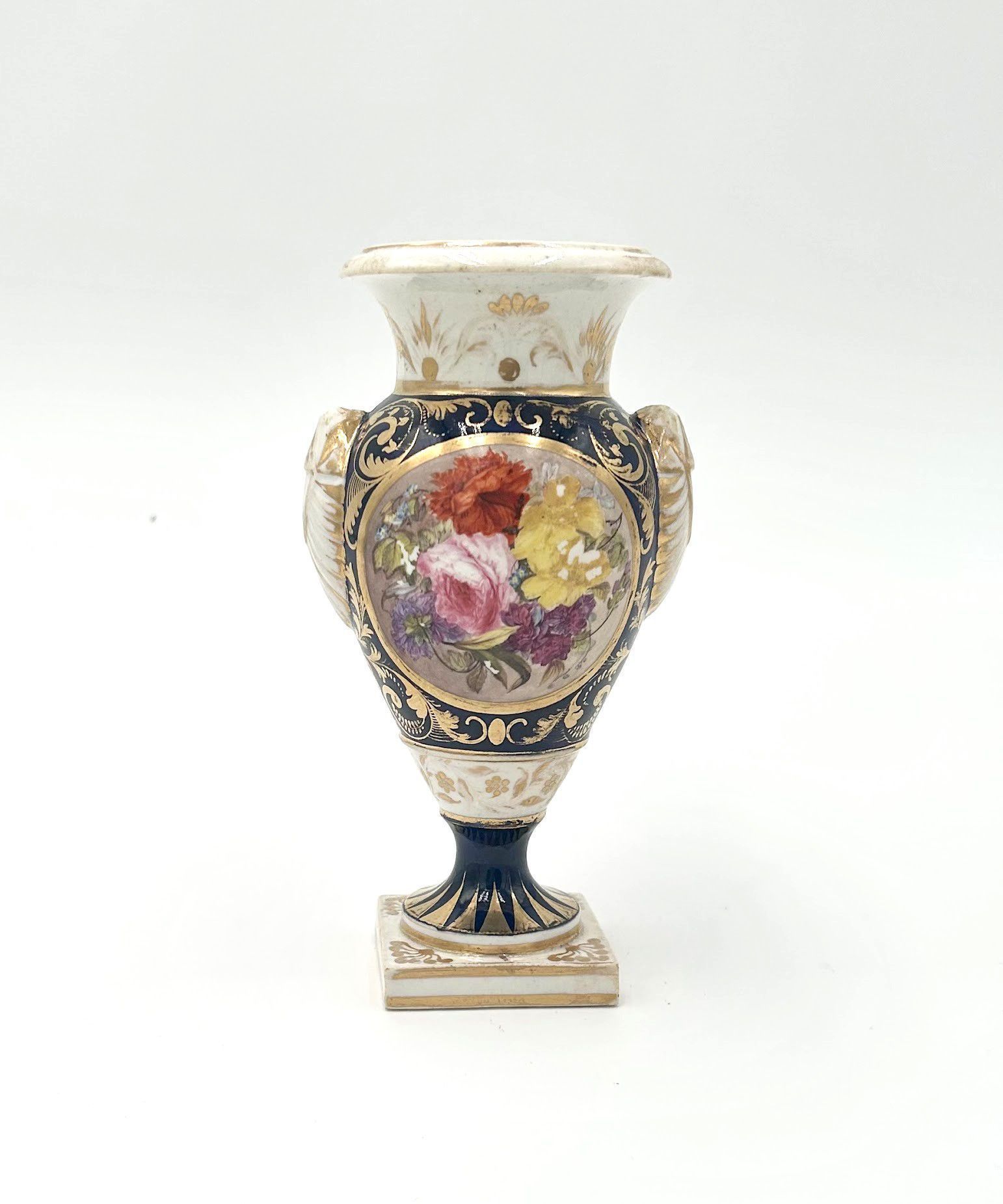 ca. 1825-1850. Miniature blue vase with floral motif and shell cartouches. The bottom of the vase features a Robert Bloor Derby mark.