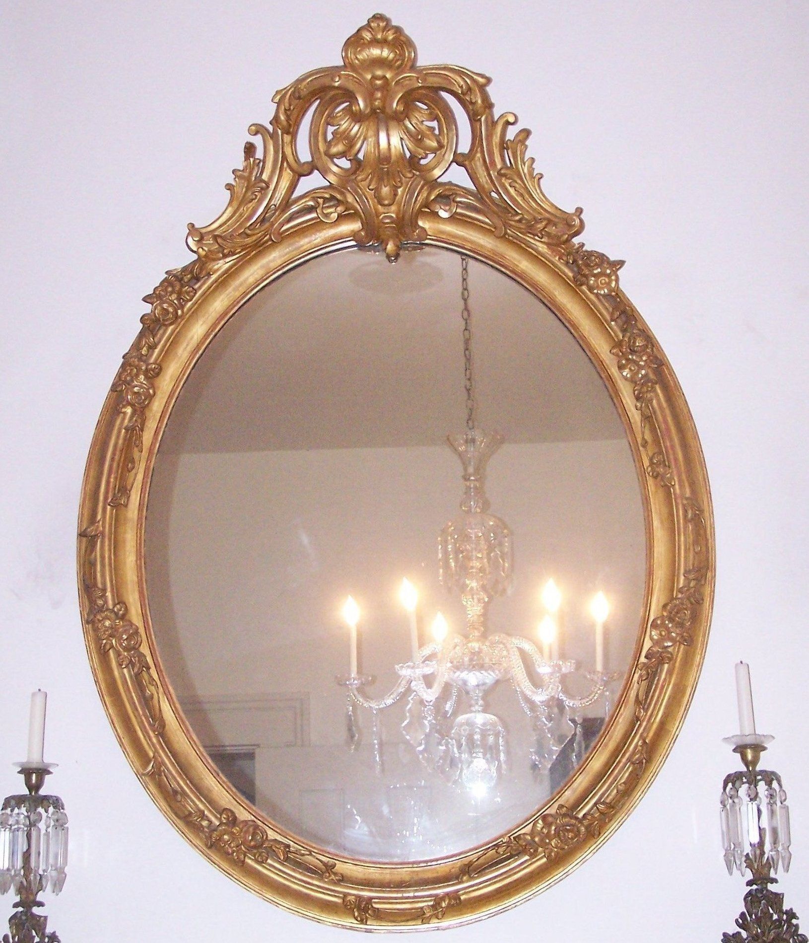 American, late nineteenth century. Victorian Rococo Revival oval mirror with a gilded frame. Features high pierced and a scrolled foliate crest. Large mirrors provided needed reflective light both during the day and in gas light from chandeliers.