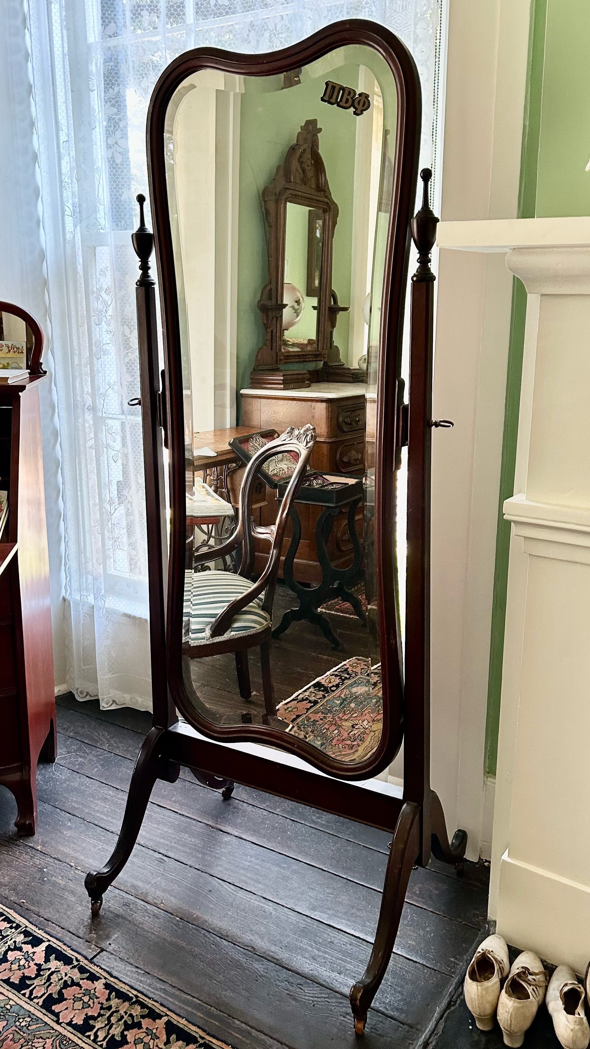 American, 1910. Colonial revival mahogany cheval mirror. Greek letter appliques are Pi Beta Phi, the Women’s fraternity that Frankie Cochran belonged to during her time at The University of Texas at Austin.