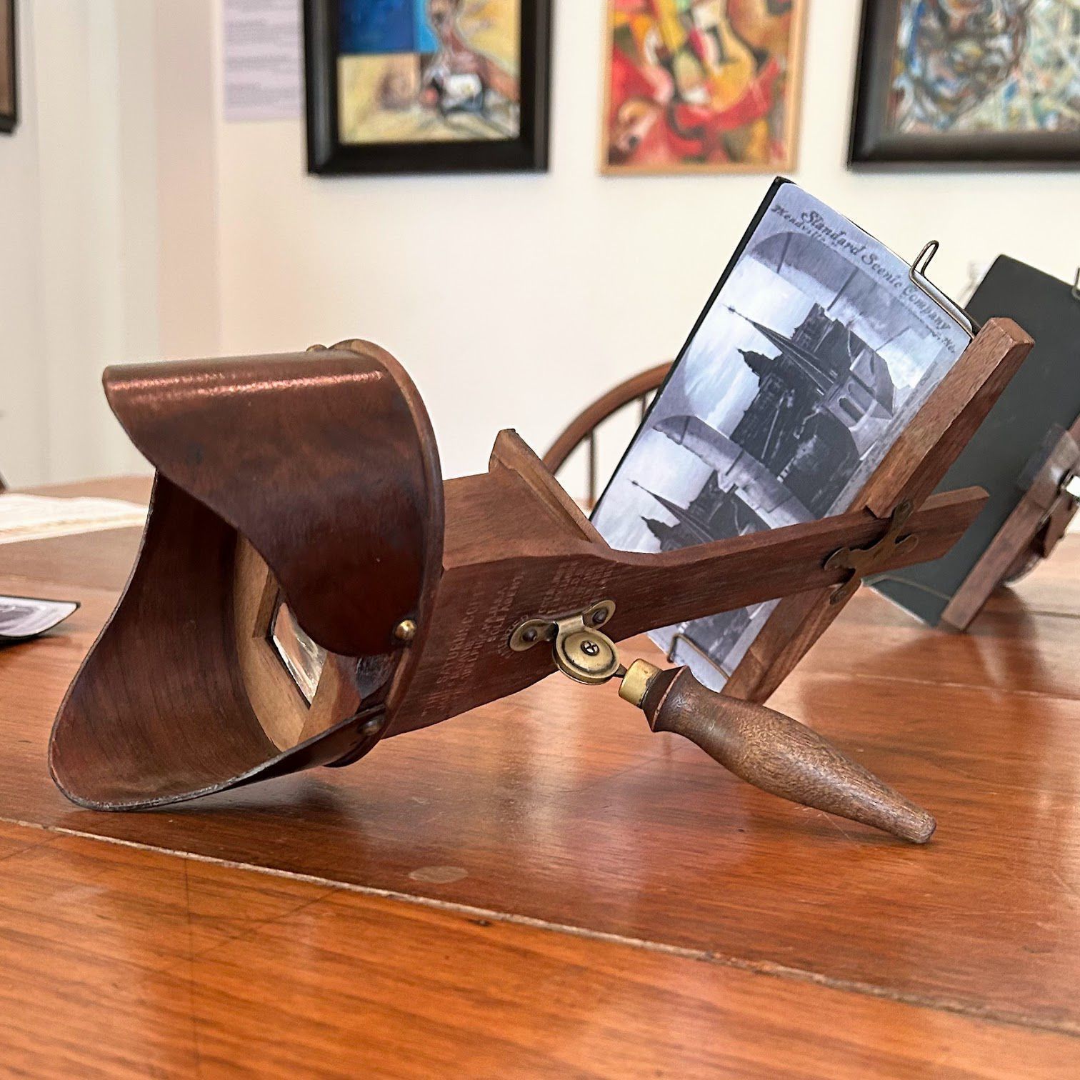 In the Upstairs Exhibit Room of the Neill-Cochran House Museum are two pairs of stereoscopes, dated between 1900 and 1930. These wood and metal devices are a bit like today’s 3D glasses: they would have been used to view separate left and right images together as one view.