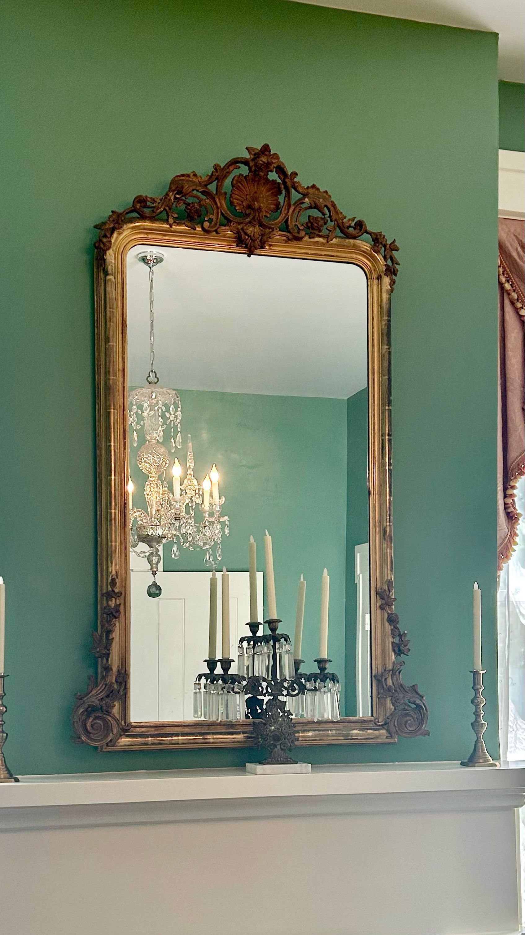 Over-mantle mirrors played an important role in American homes before the advent of electricity, because they double the light by reflecting the candles lit on the mantle as well as the light from the chandelier.
