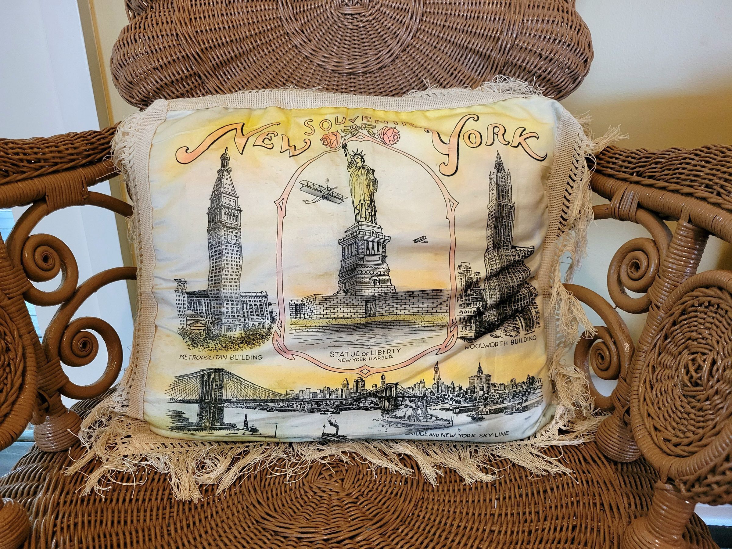 On a wicker armchair in the upstairs hallway of the Neill-Cochran House Museum sits a decorative pillow from the 1910s. This fringed New York City-themed silk souvenir pillow depicts the Metropolitan Building, the Woolworth Building, the Statue of Liberty, and the Brooklyn Bridge with the New York City skyline in the background.