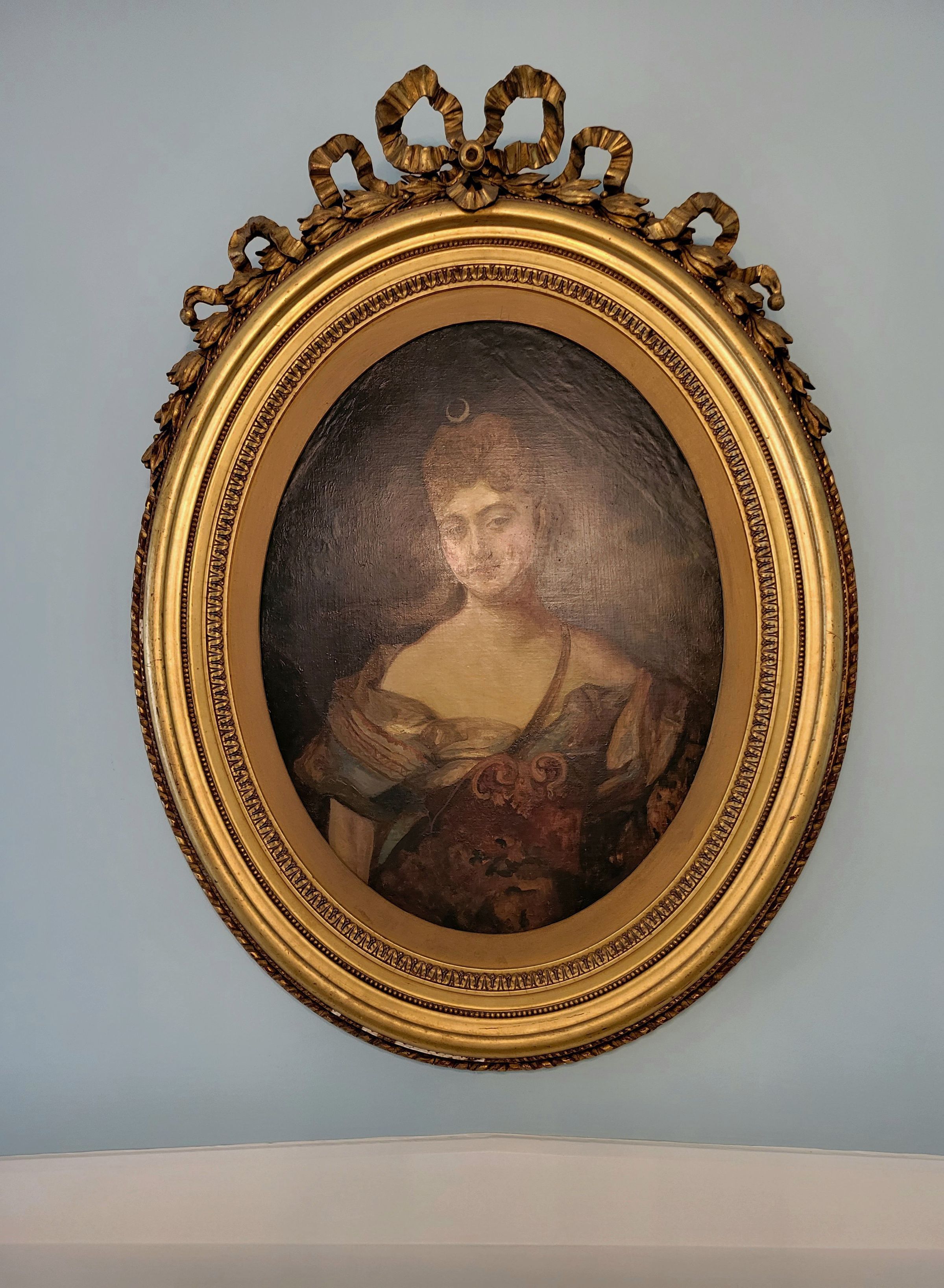 Unknown origin, nineteenth century. Oil on canvas portrait of a woman in fancy dress as Diana of the hunt. Held in gold-leaf wood frame decorated with bow and flowing ribbon carving on the top and sides.