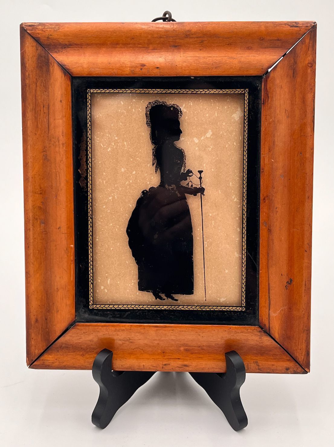 This full-length portrait of a lady wearing a long dress with bustle is a “silhouette” or “profile”.