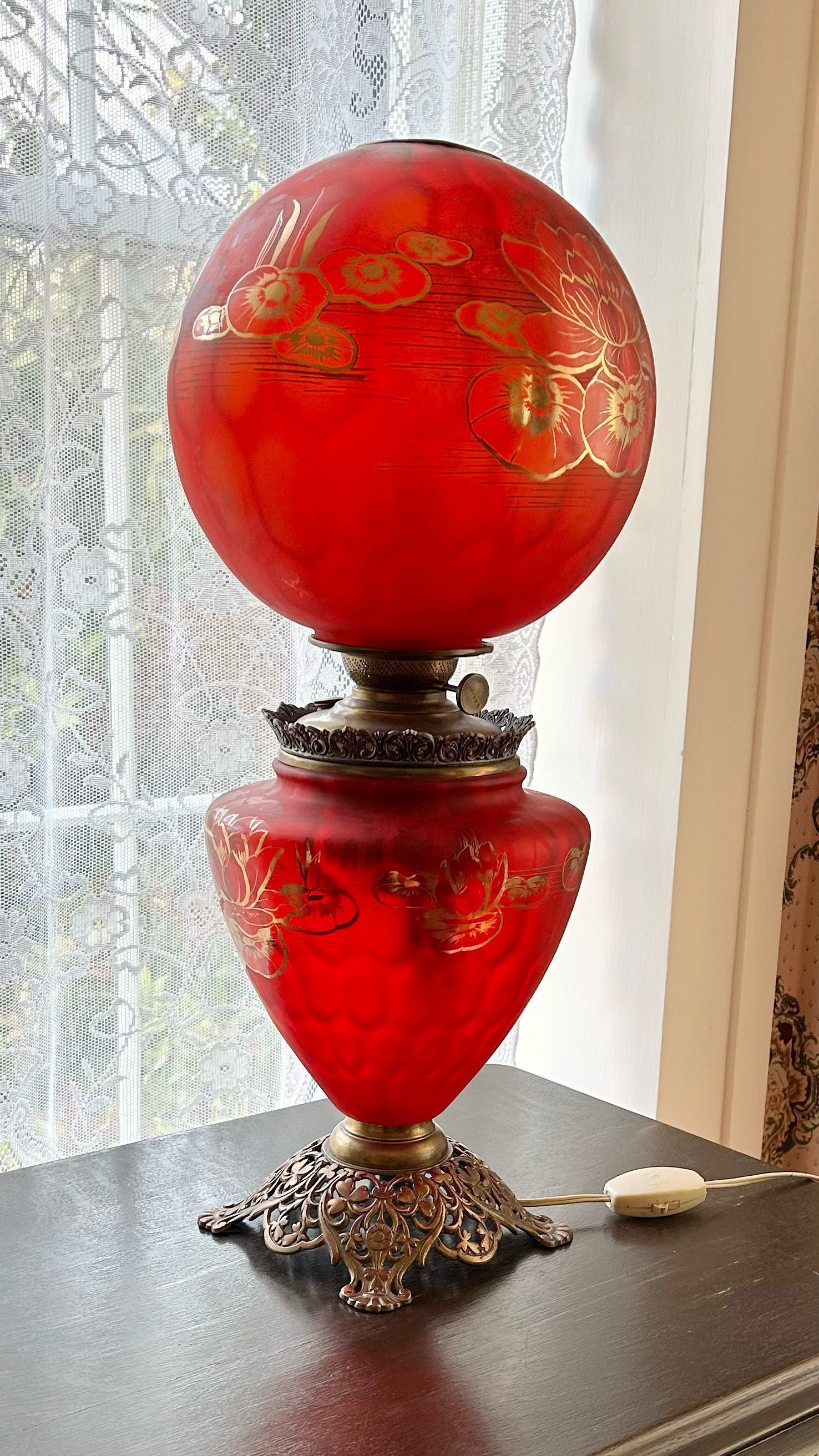 On a table in the northeast corner of the Cochran Bedroom sits an eye-catching cranberry red glass table lamp. It is an American-made oil lamp from the 1890s that has been electrified for modern use.