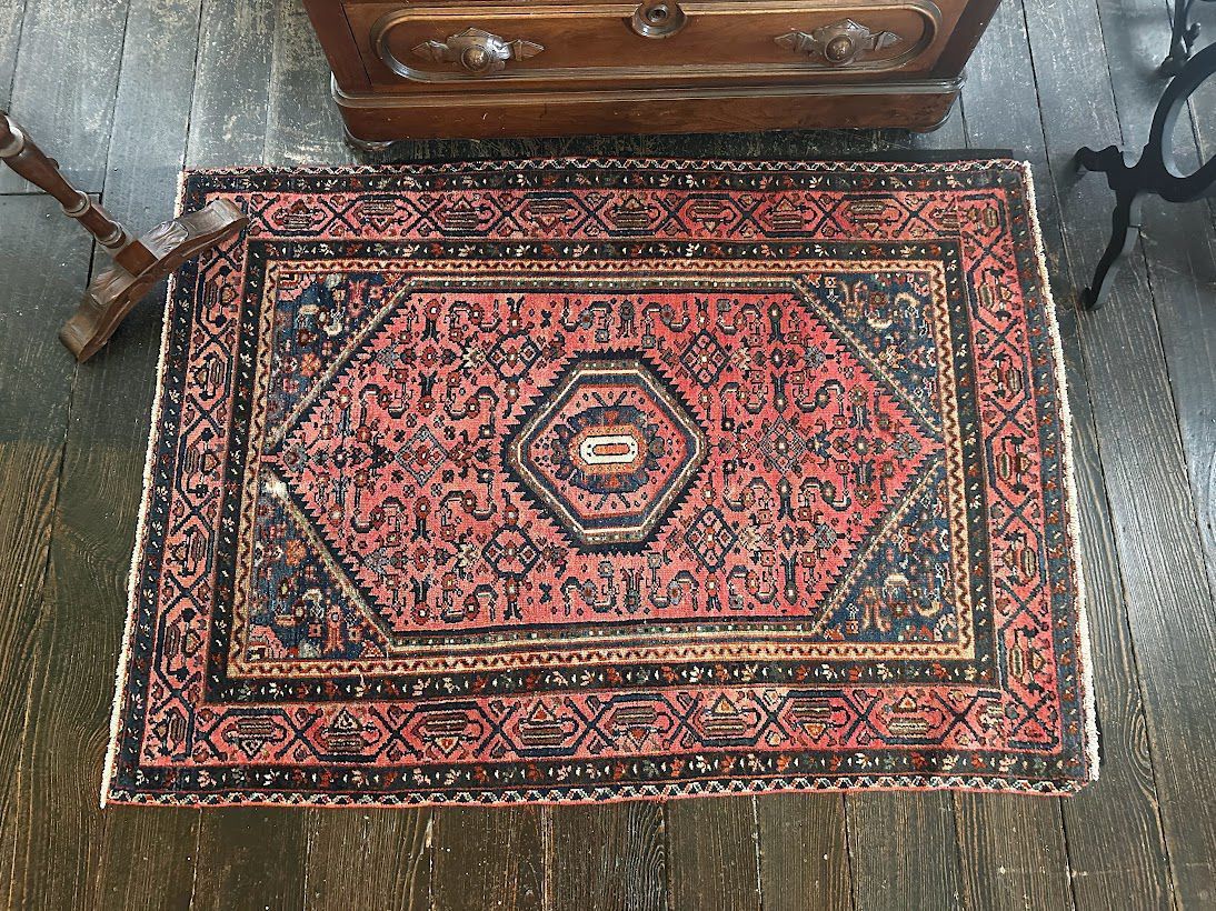 In the center of the floor in the Cochran Girls' Bedroom is a charming 3.5'x5' Persian rug from the mountainous Hamadan region of western Iran. The rug is made of hand-knotted wool and features a rose-colored field with a white center medallion, blue shoulders, and an indigo border. It has a combination of geometric and floral designs that typify rugs from the Hamadan region. Given its small size and single-weft construction, this rug was likely woven in a mountain village of Hamadan and not in one of the urban centers like Malayer or Sarouk.