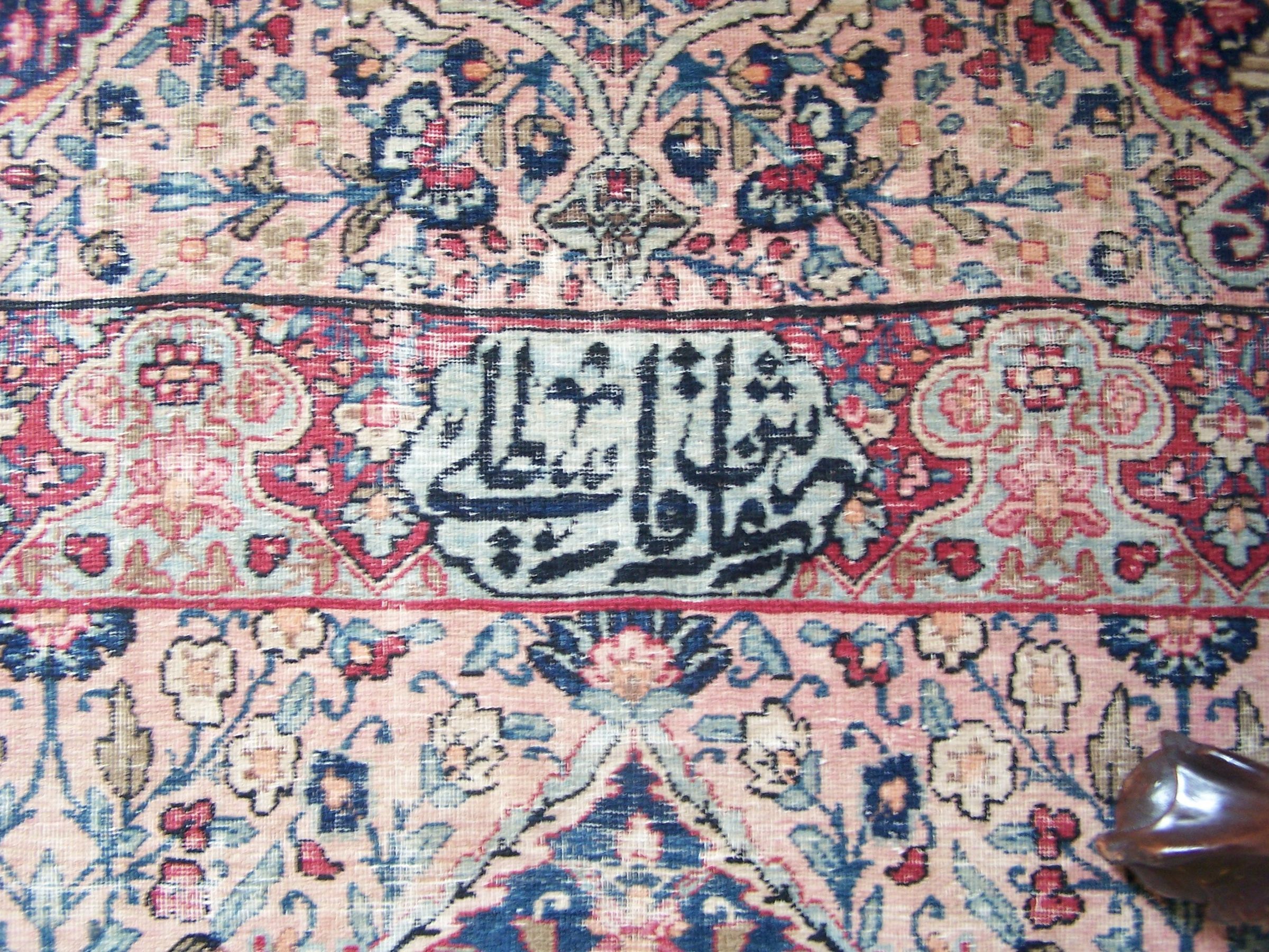 Iranian, ca. 1860. Royal Kermanshah Rug, knotted wool on cotton. Features a design of 17 doves clasping a stand, each surrounded by delicately worked vines and flowers. The rug is signed, indicating that a single artist produced it.