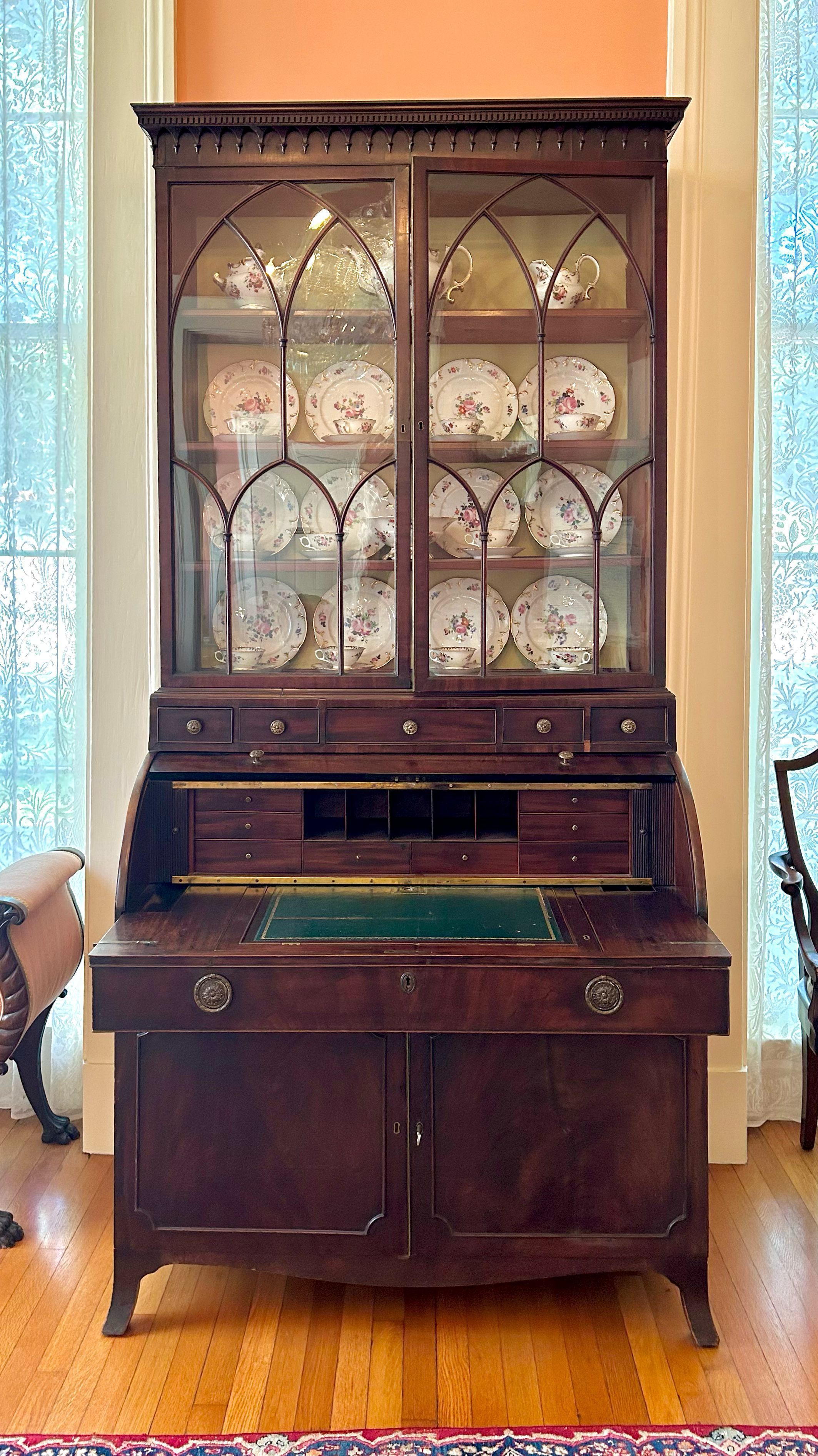 English, ca. 1810. Late Georgian Regency mahogany secretary with "Gothic" ogee mullions and cylinder cover and French splayed feet.