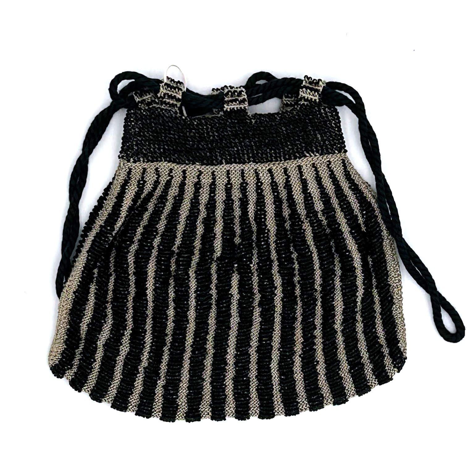 This small black and grey striped beaded drawstring bag is made of a grey knitted material covered in a vertical striped design of black beads, with beaded loops to fit the black cord of the drawstring top through. The design of the bag is heavily influenced by the Art Deco style prevalent in the 1920s-1930s. Some other popular examples of the Art Deco style include the Chrysler Building and Empire State Building in New York City, and the fashion illustrations and artwork of Erté.Acquisition
