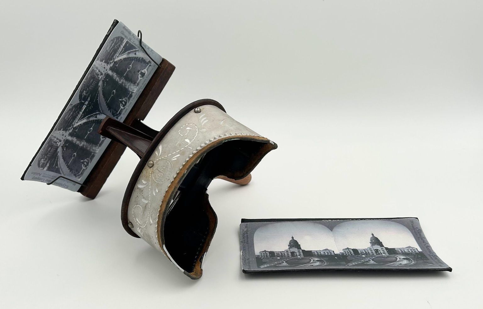 In the Upstairs Exhibit Room of the Neill-Cochran House Museum are two pairs of stereoscopes, dated between 1900 and 1930. These wood and metal devices are a bit like today’s 3D glasses: they would have been used to view separate left and right images together as one view.