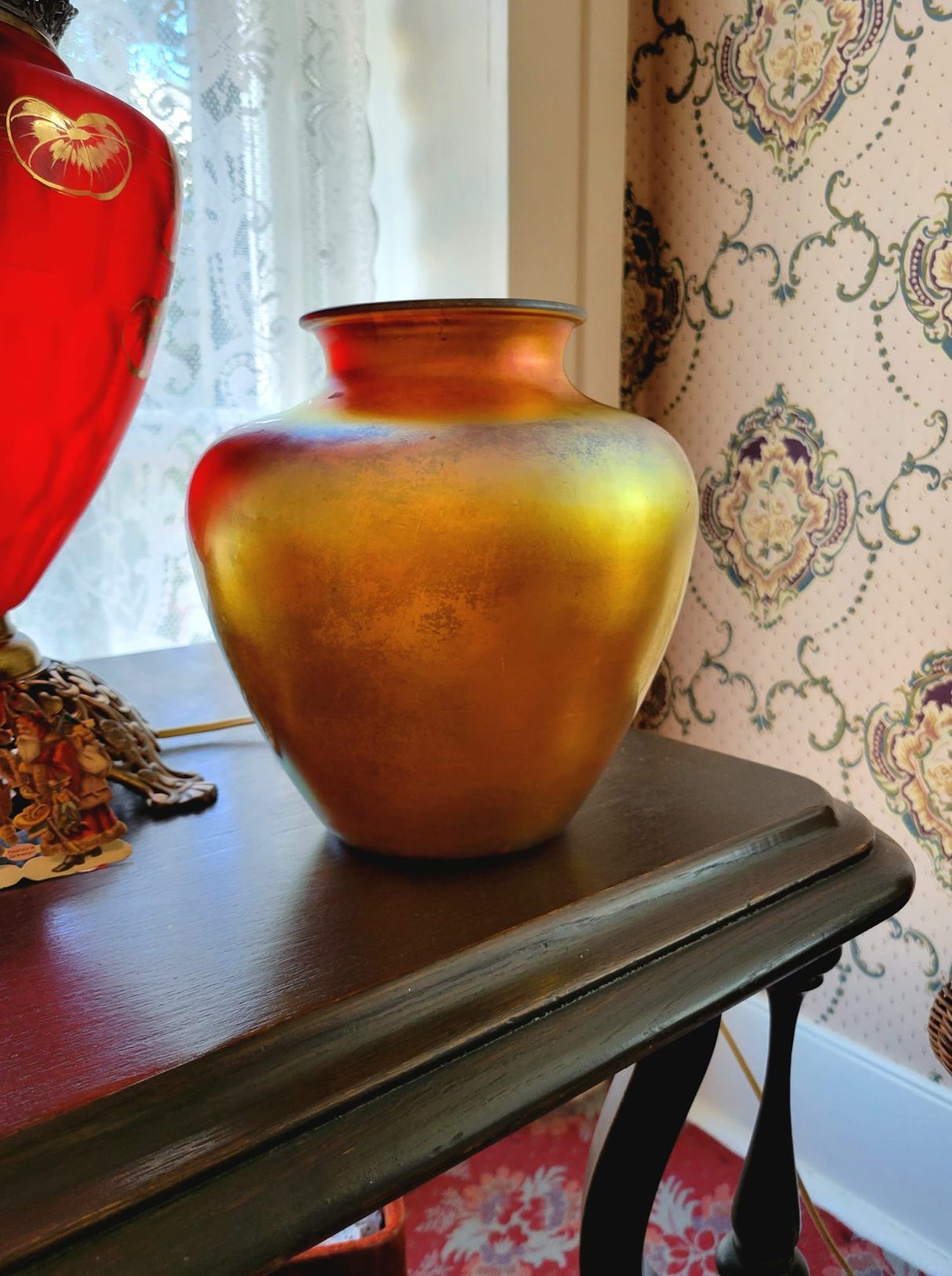 Glimmering in the NCHM Upstairs Hall is a globular vase of gold-iridized lead glass. The vase seems to glow with an inner light, and its surface plays with the light and colors of its surroundings.