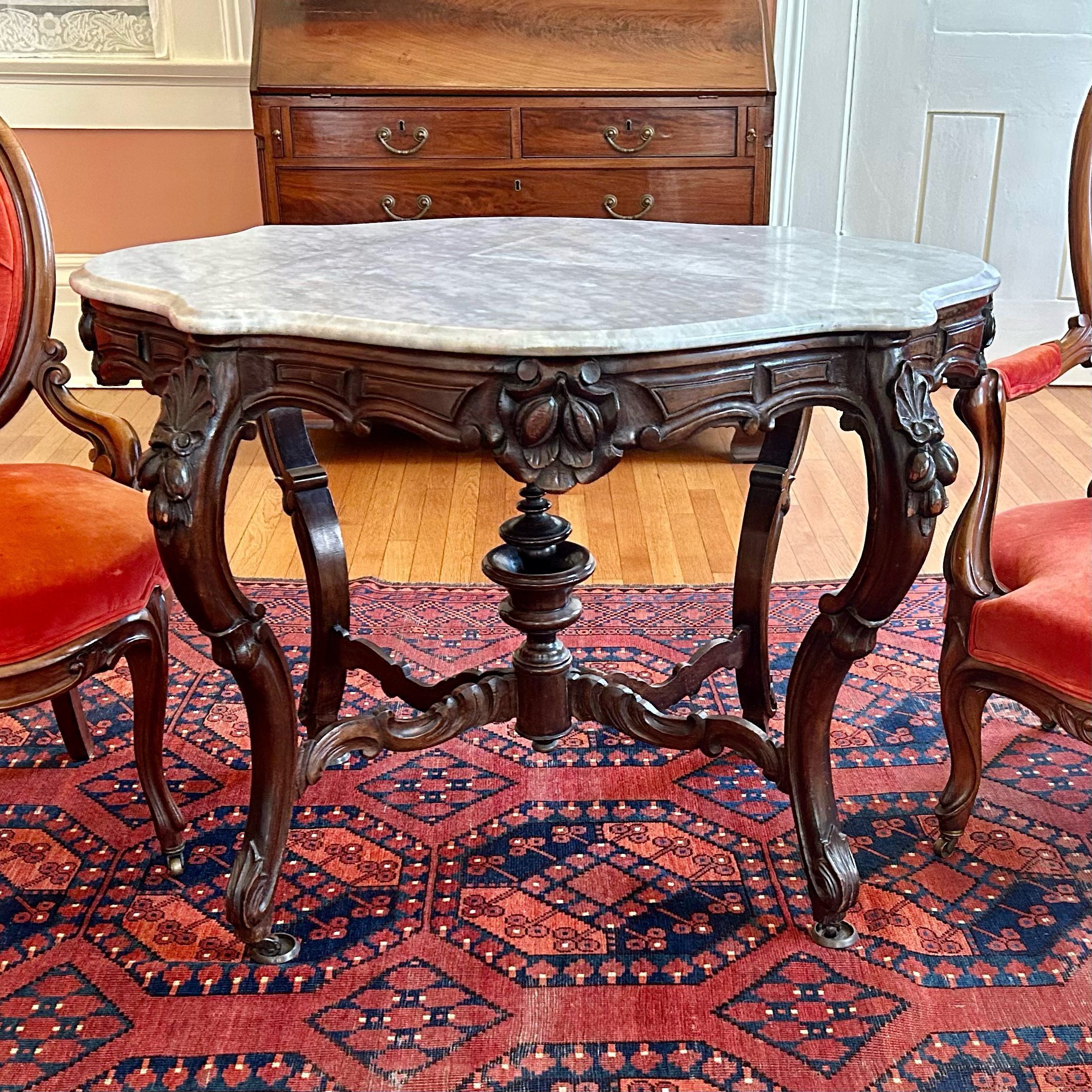 Center tables were a focal point of the formal parlor; the name refers to decoration on all four sides; a large oil or kerosene lamp often stood on these tables.