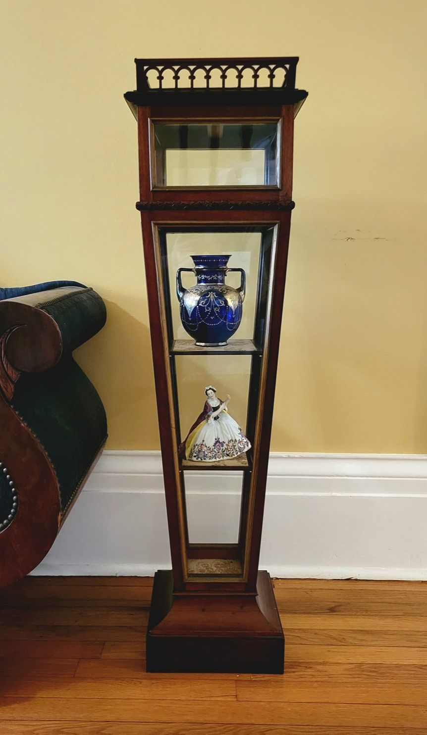 Flanking the Empire-style sofa in the NCHM Foyer is a pair of tapering display cases known as vitrines. This pair of vitrines are in a Neoclassical style and were manufactured in England during the 1880s. They are made of mahogany and glass, and the tops of the interior shelves are upholstered in silk.