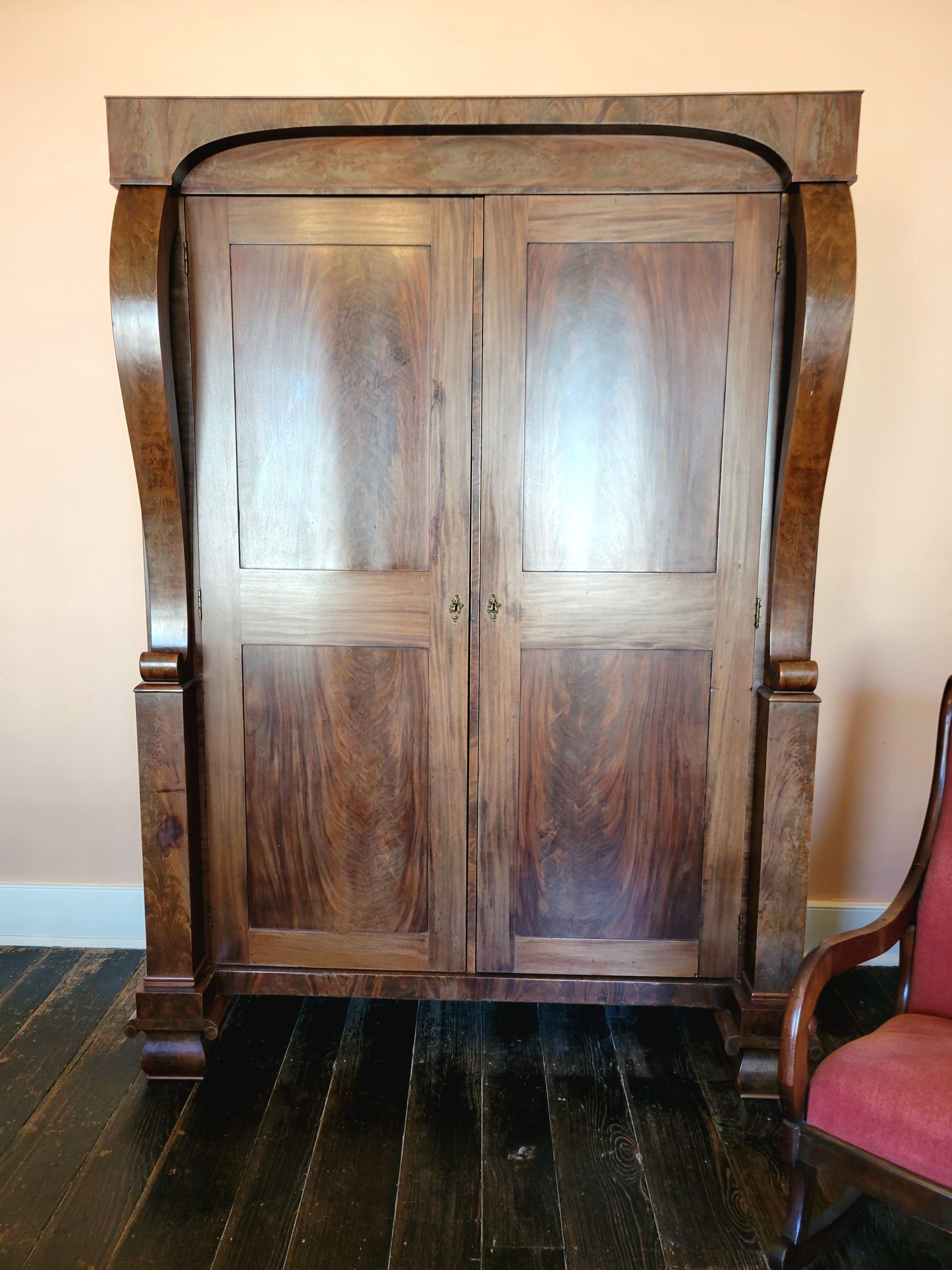 The armoire sits on pedimented feet that look like Ionic column capitals. The frame stiles are fronted by scrolling pieces that project out from the front, while the cornice is simple and bold. It has double doors each made of two panels with a horizontal piece. The only fixtures on the exterior are the hinges and two brass locks, one on each door. Inside the left door bay is a hanging space, and inside the right door bay are four shelves and three drawers each with a brass pull.