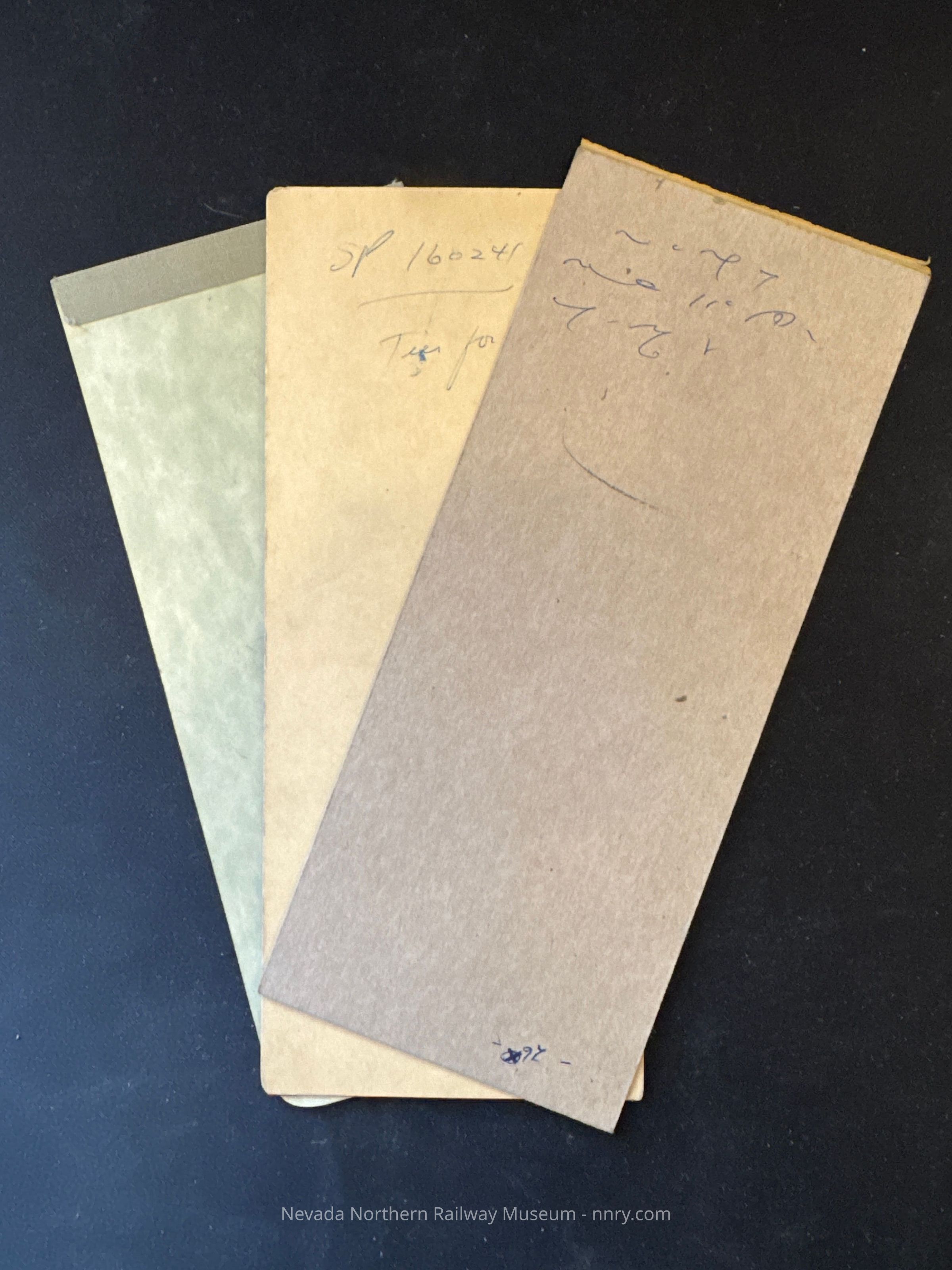 Cardstock from the back of form pads with notes, one in shorthand. Three cards total.