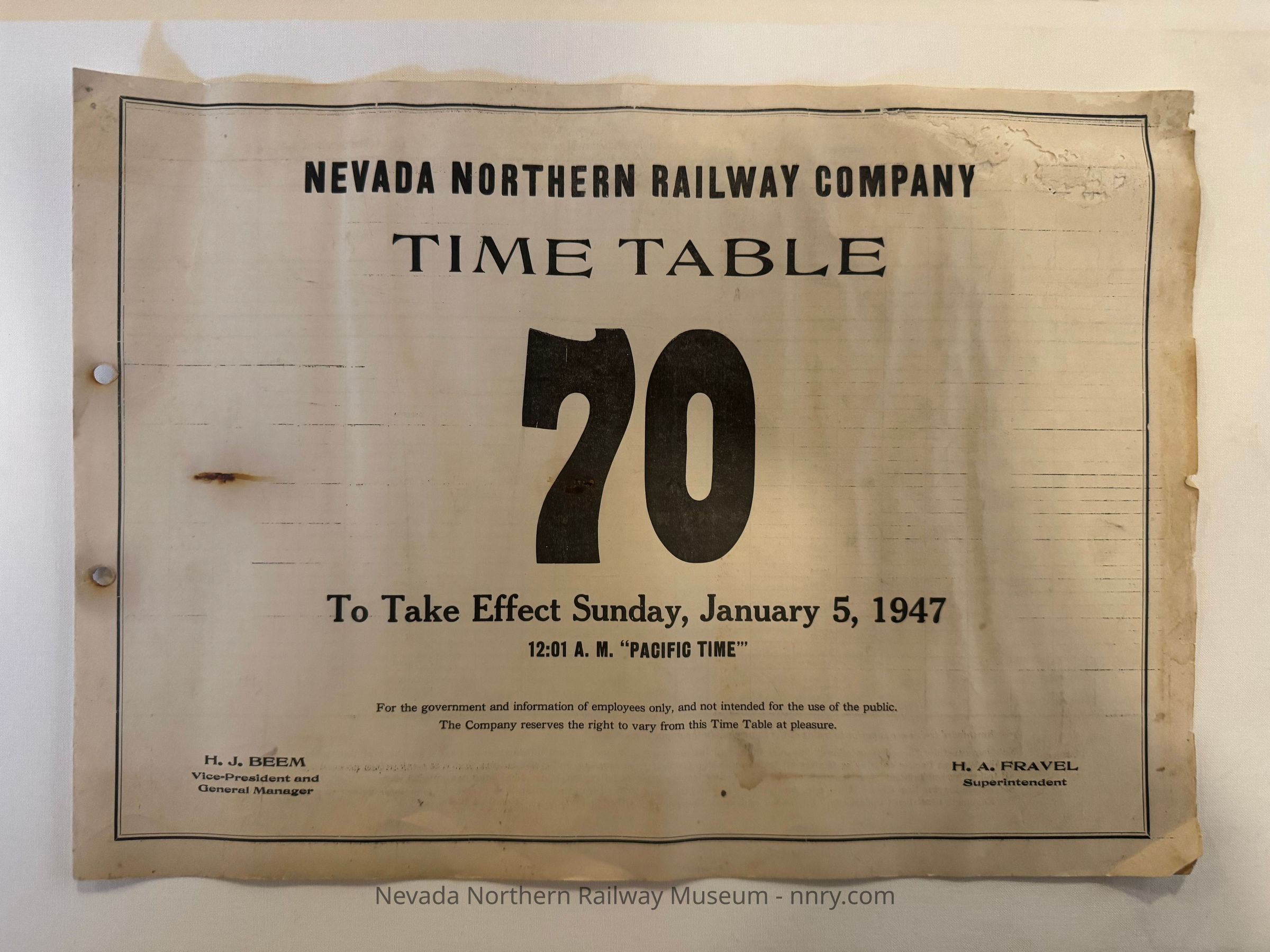 Nevada Northern Railway timetable no. 70, January 5, 1947.
