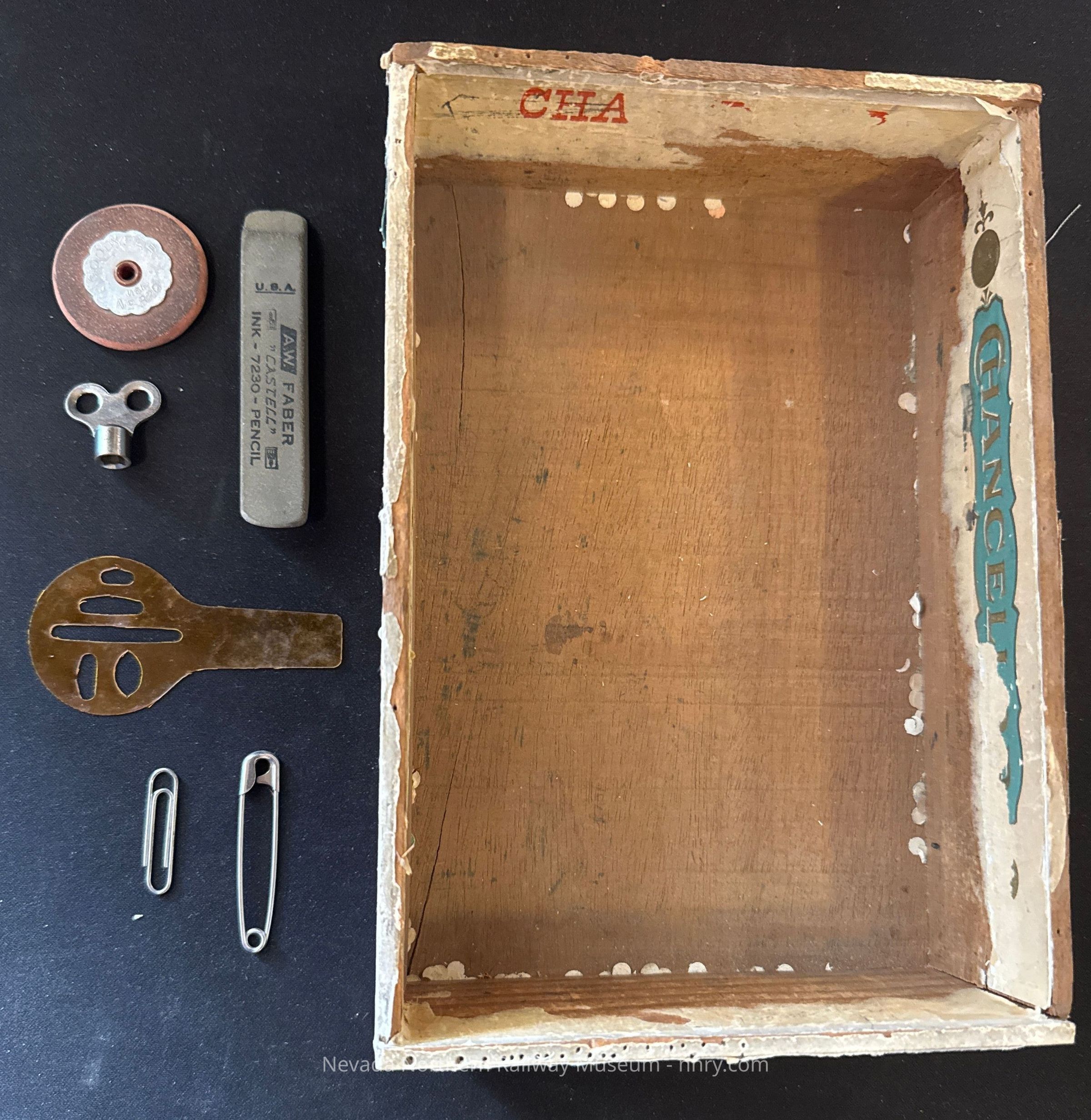 Cigar box used as an office tray with two erasers (ink and pencil eraser, , drafting stencil, key, safety pin and paper clip.Category