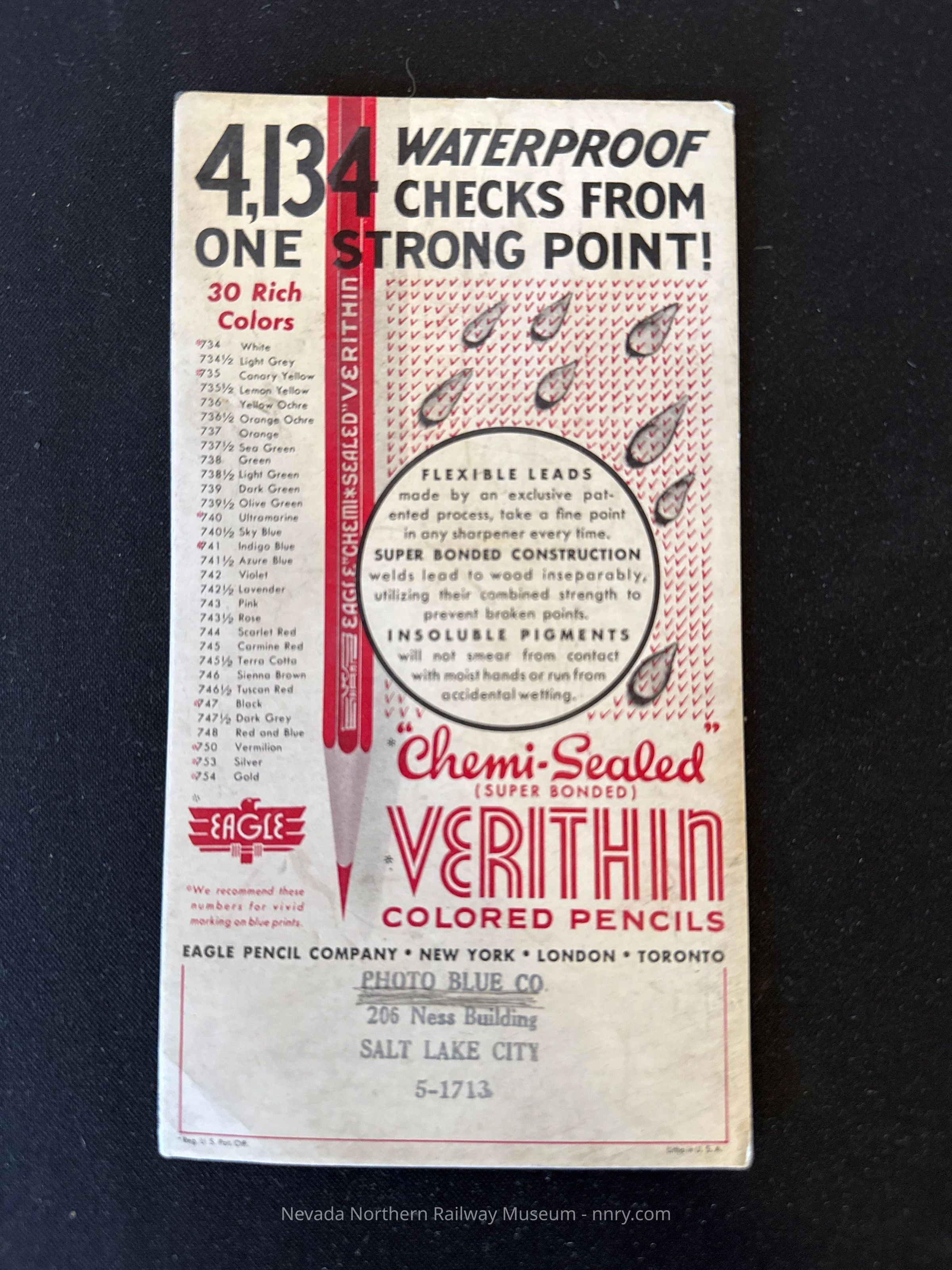 Advertisement card for Verithin colored pencils to be ordered from the Photo Blue Co. in Salt Lake City.