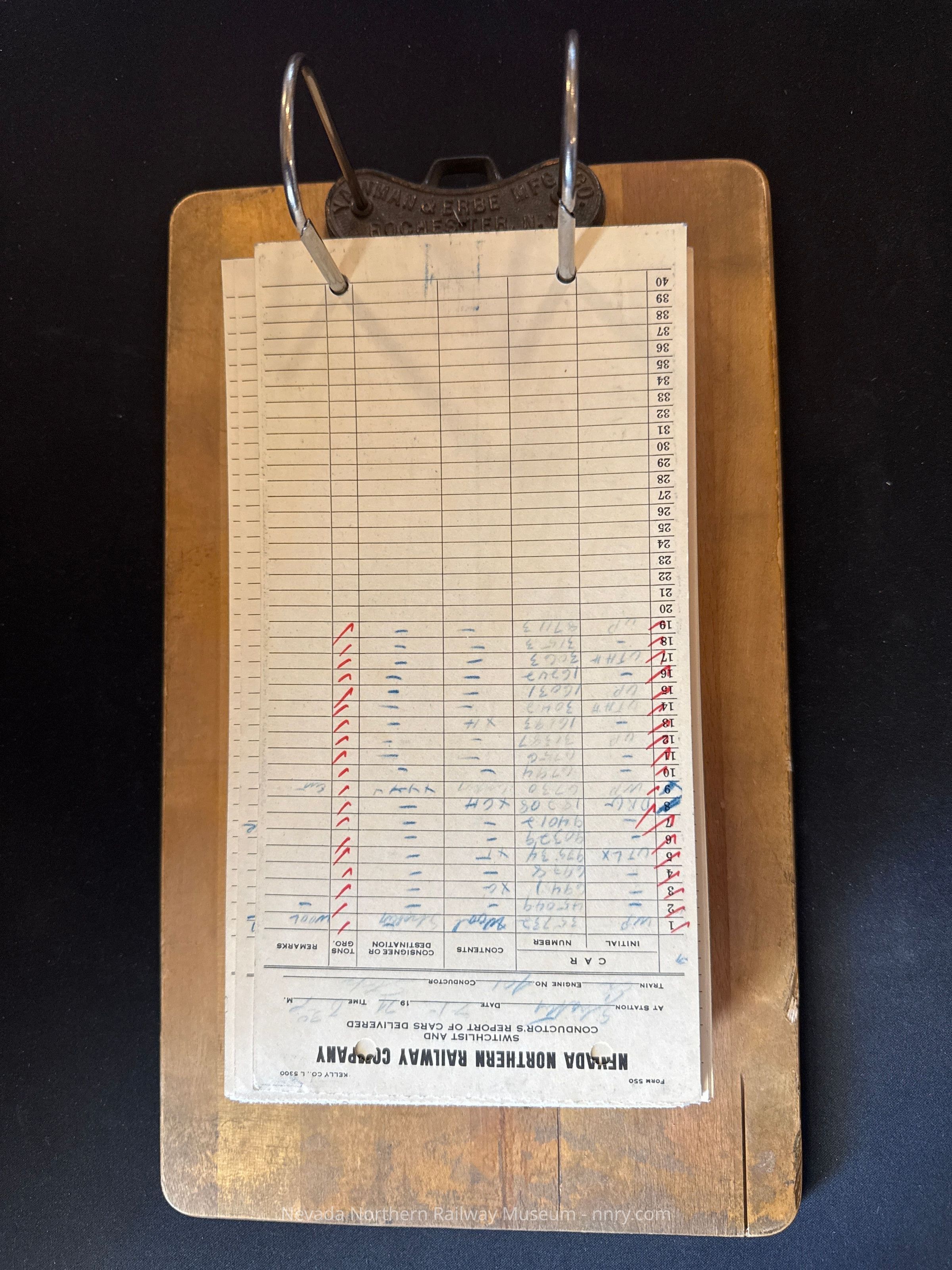 Clipboard with switchlist and conductor's report of cars delivered reports, 1974-1983.Category