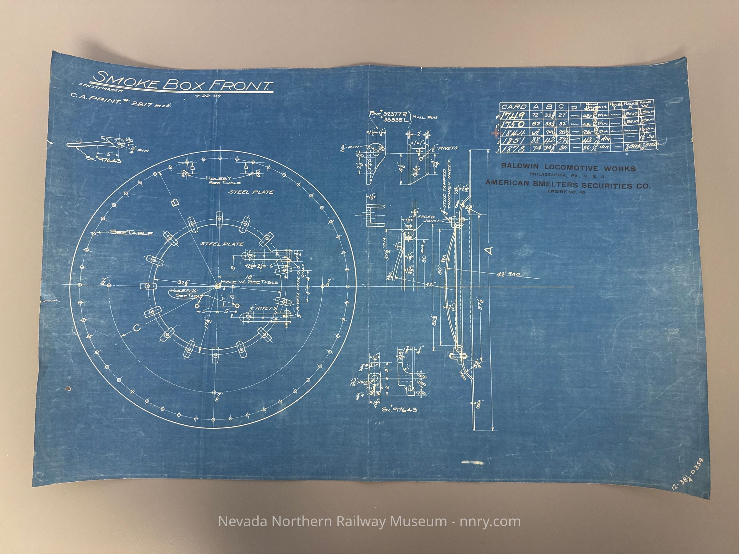 Blueprint for the smoke box front on locomotive #40, July 22, 1909.