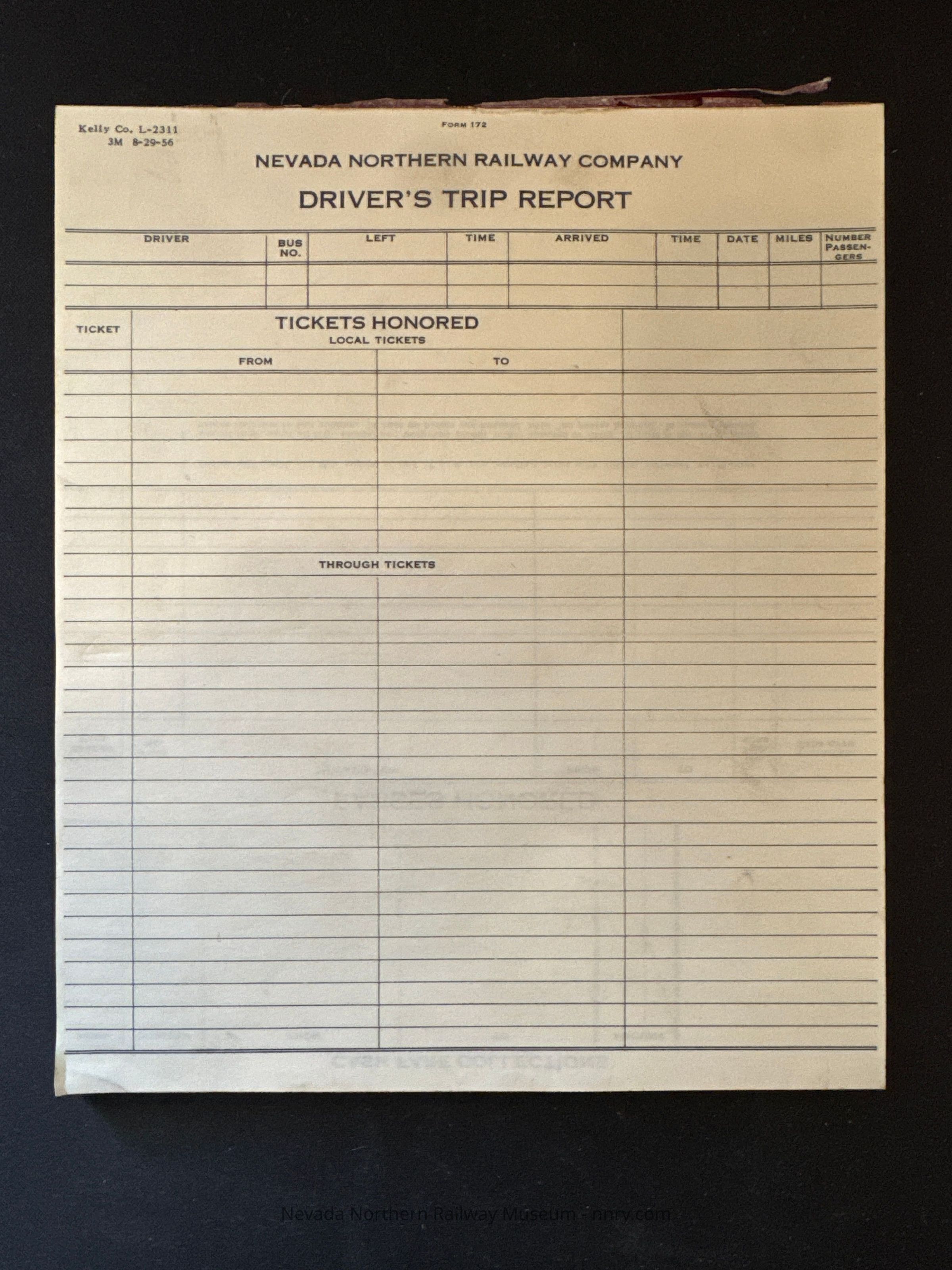 NNRy bus driver's trip report form pad, form no. 172, August 29, 1956.