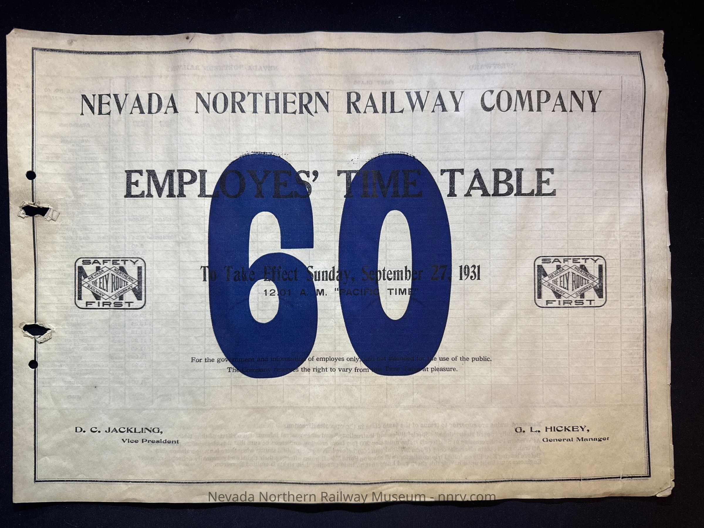 Nevada Northern Railway timetable no. 60, September 27, 1931.