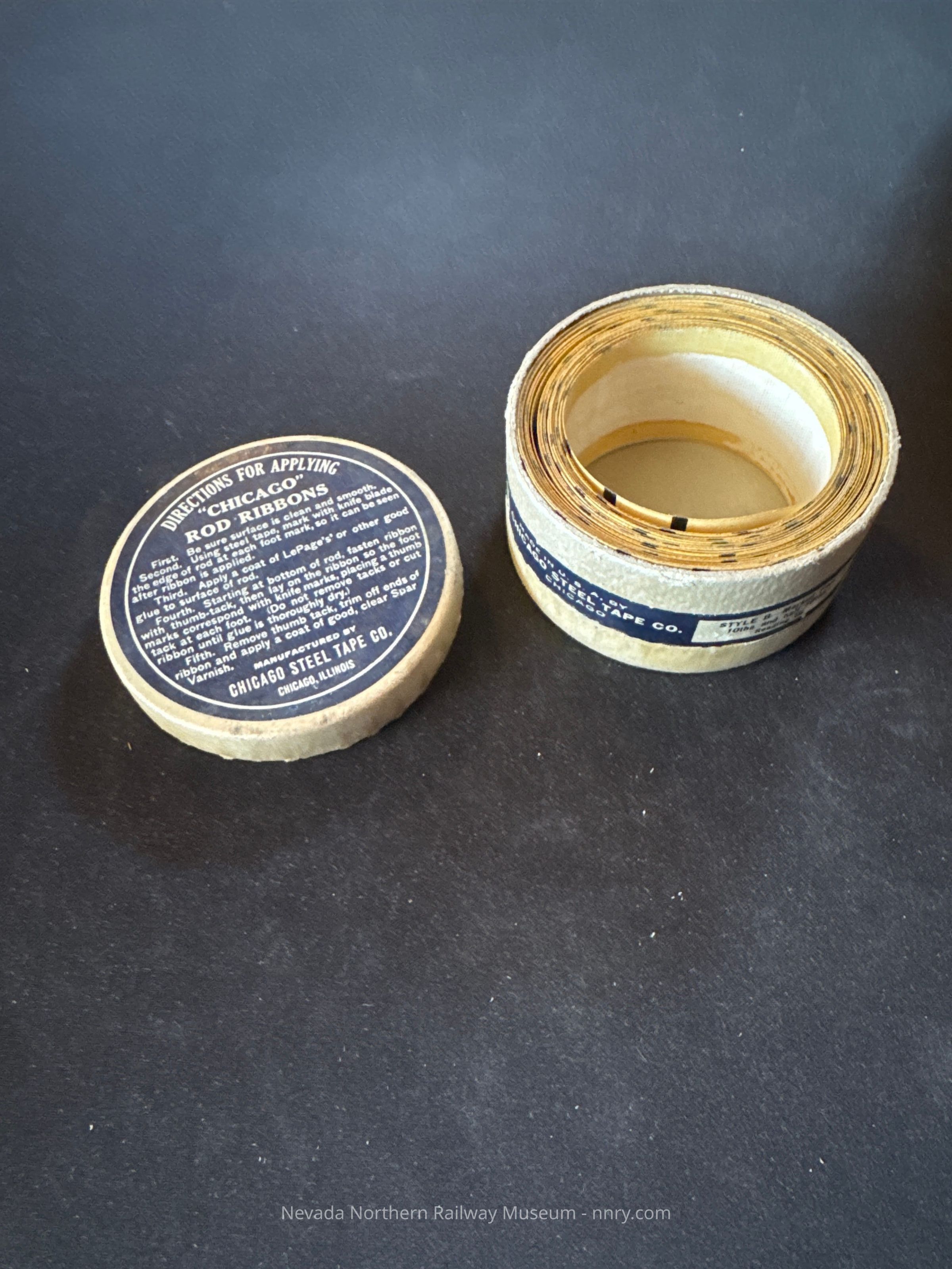 Container of "Chicago" leveling rod ribbon, length 16.5 ft, style B, marked feet 10ths and half 10ths, reading up.Made/Created