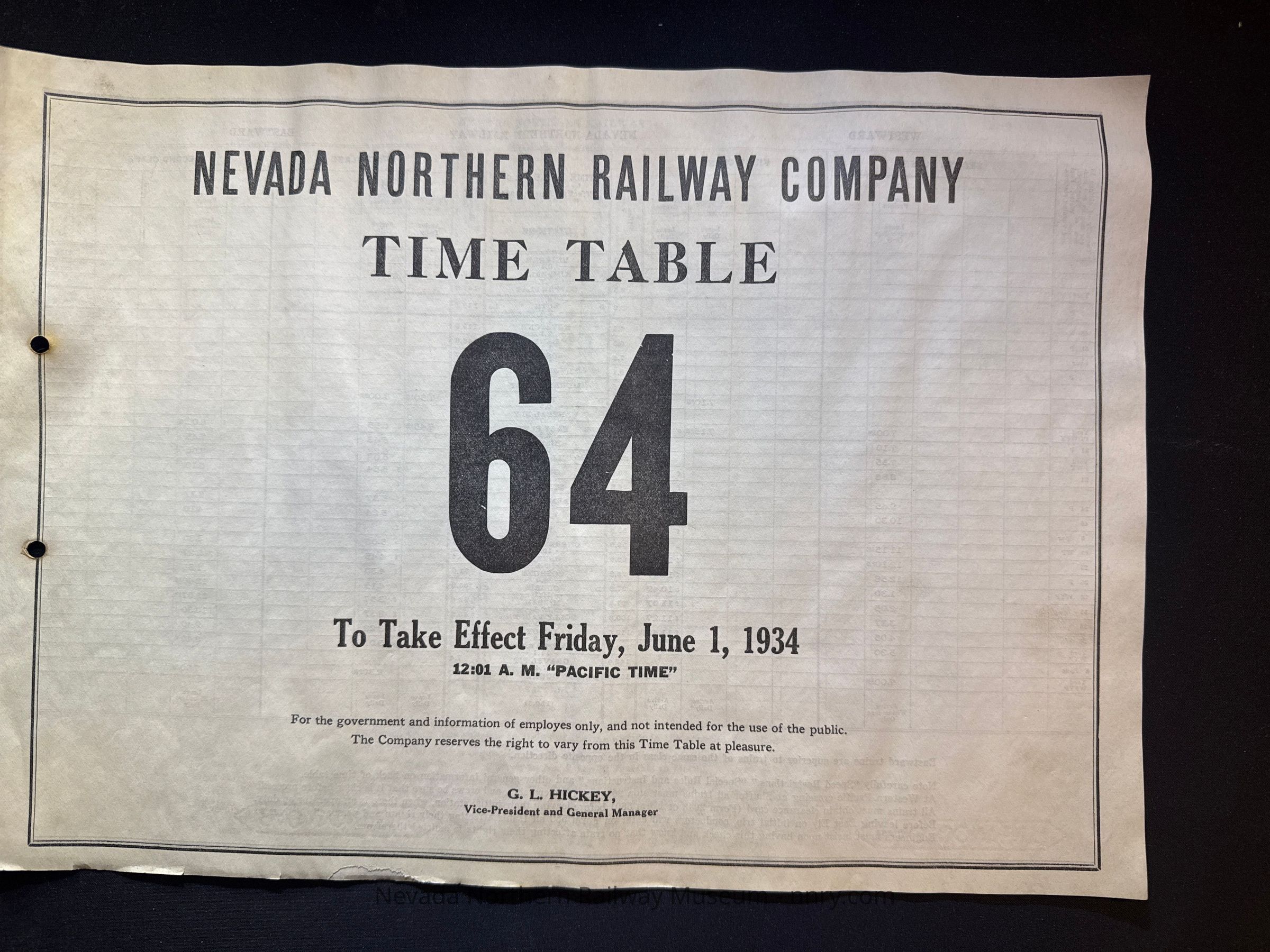 Nevada Northern Railway timetable no. 64, June 1, 1934.